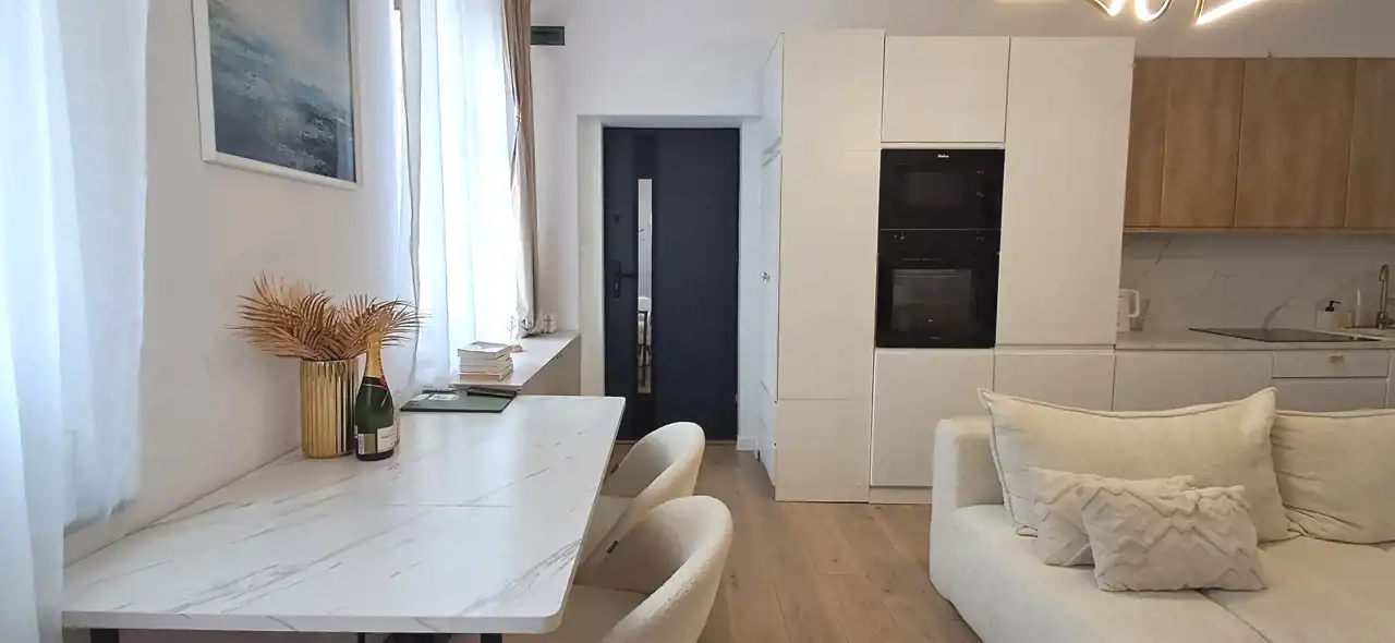 Mieszkanie jest zadbane i gotowe do zamieszkania – w cenie pozostaje zabudowa kuchenna ze sprzętem AGD, meble z salonu i sypialni.