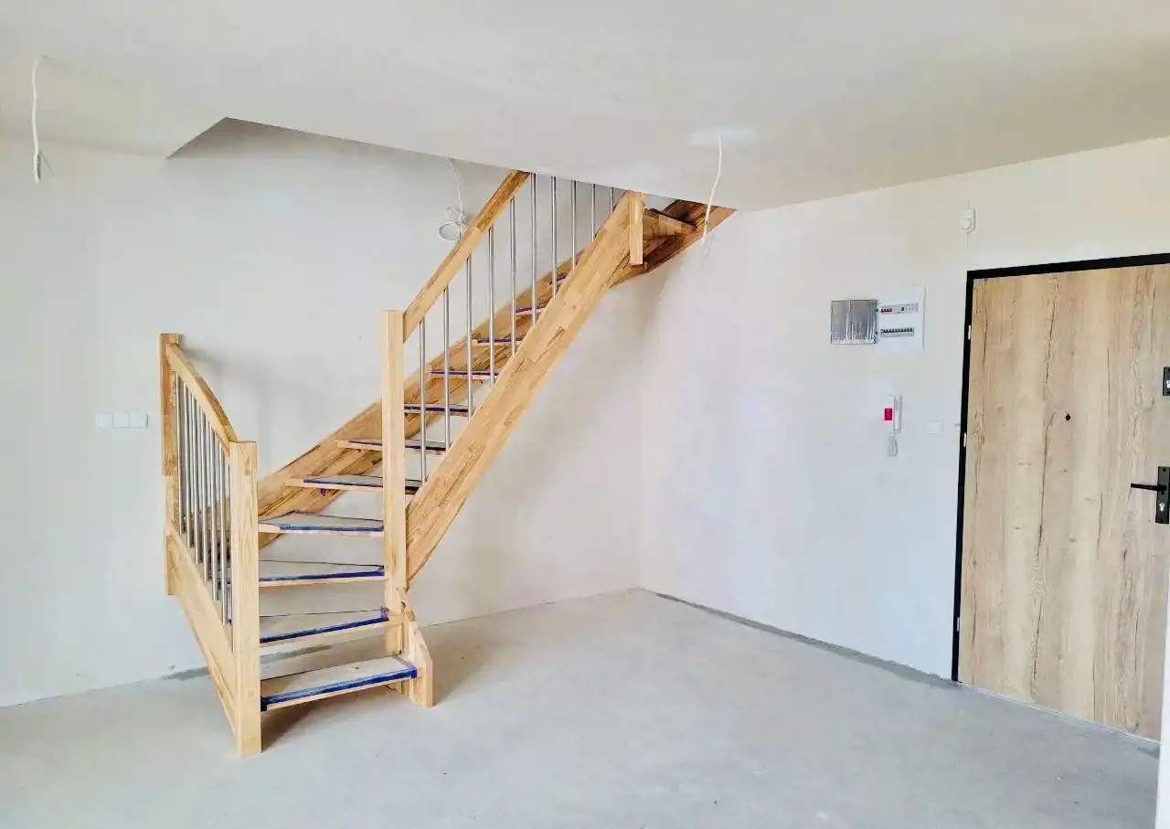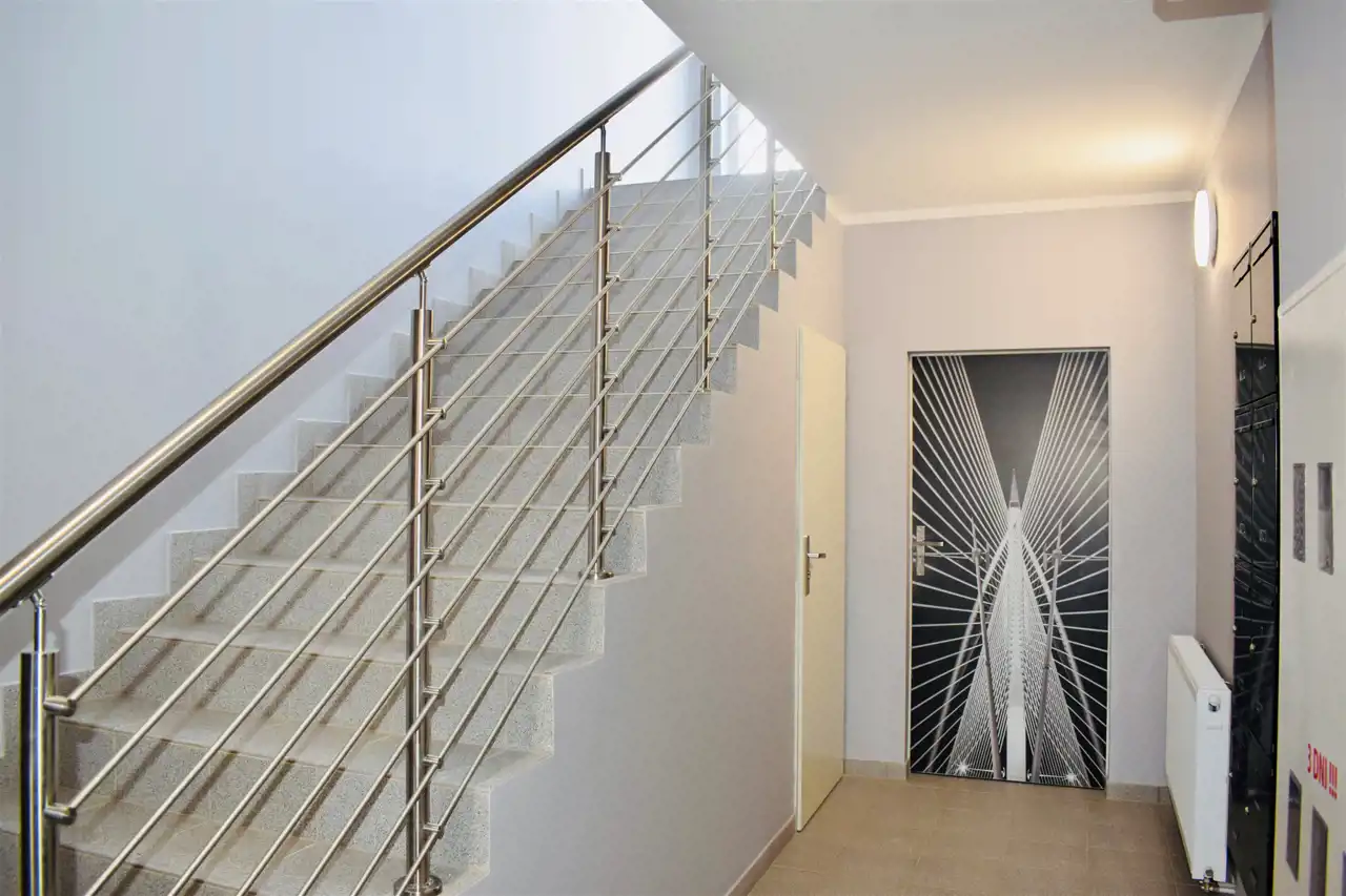 Do mieszkania przynależy miejsce gospodarcze na przechowywanie np. rowerów. i prywatne miejsce parkingowe z możliwością zakupu. Dwa poziomy łączą drewniane schody. Mieszkanie ustawne i przestronne, układ pomieszczeń bardzo funkcjonalny, co w znacznym stopniu wpływa na komfort użytkowania. Ogrzewanie gazowe.
