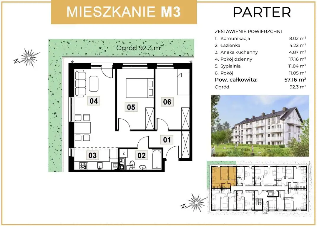 - Charakterystyka mieszkania 57.16 m2, 3 pokoje