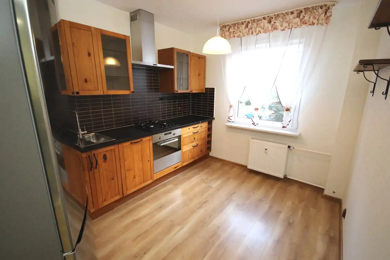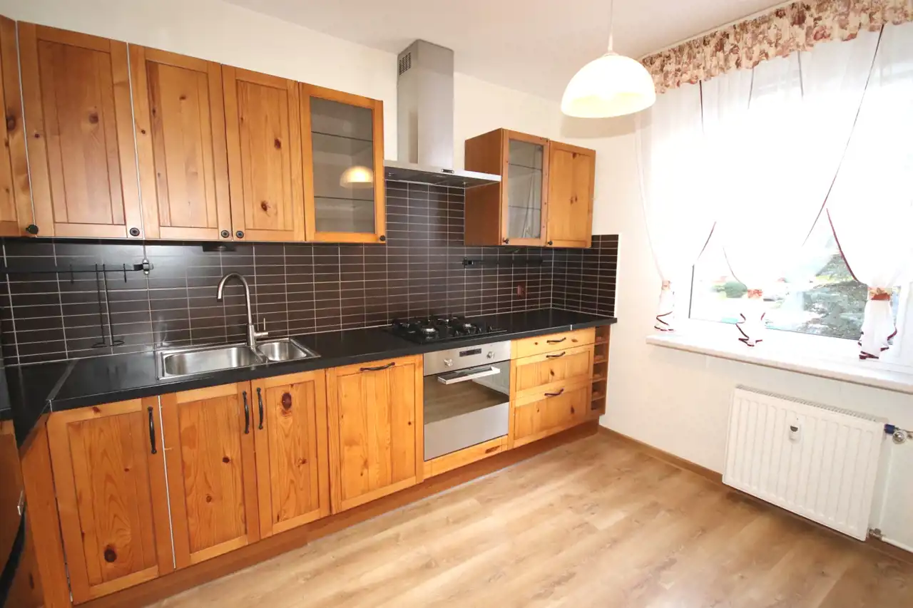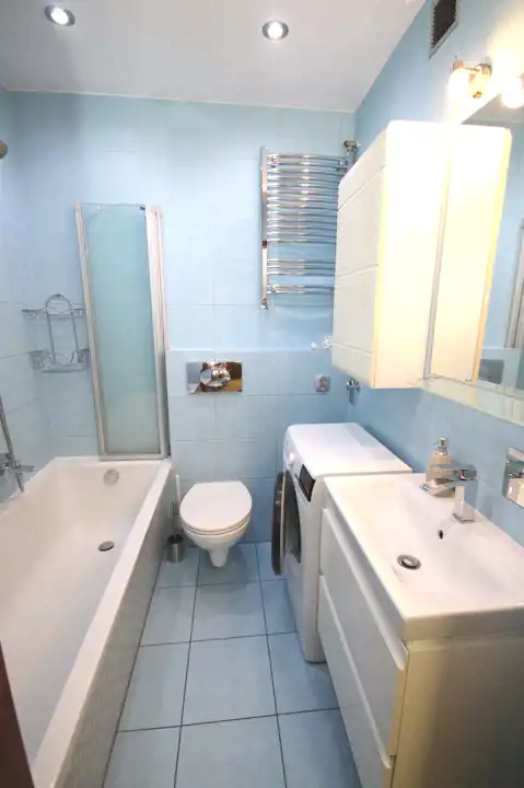 - W cenie kuchnia w zabudowie ze sprzętem AGD (piekarnik, okap, płyta gazowa, zmywarka, lodówka); w łazience pralka i w przedpokoju szafa w zabudowie.