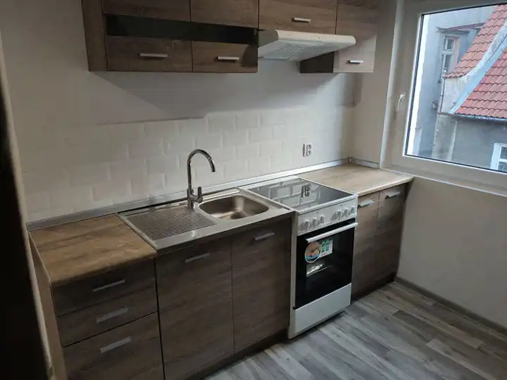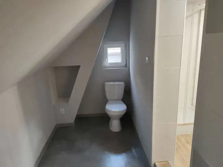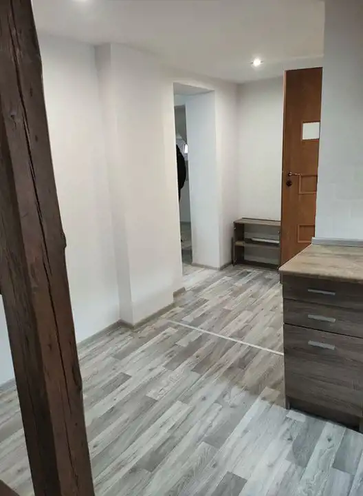 1 pokój, pokoik z aneksem kuchennym, przestronny przedpokój, dwa pomieszczenia ze skosami, duża łazienka z toaletą.
