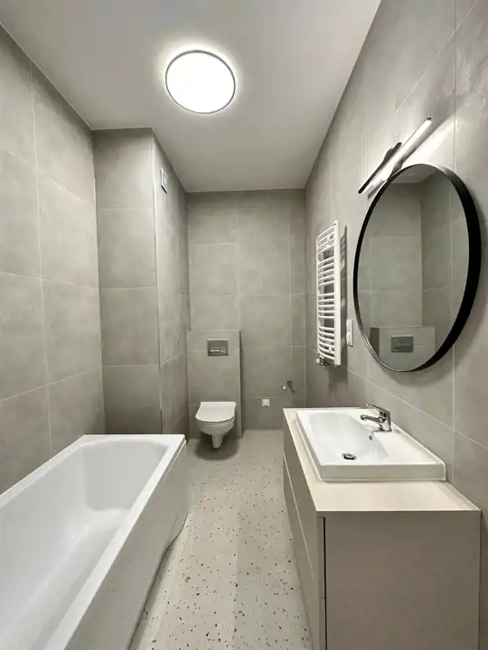- Nowoczesna łazienka wykończona w jasnych tonach wyposażona jest w kabinę prysznicową, toaletę oraz umywalkę z szafką. Przemyślane rozmieszczenie sprzętów zapewnia funkcjonalność i komfort użytkowania.
