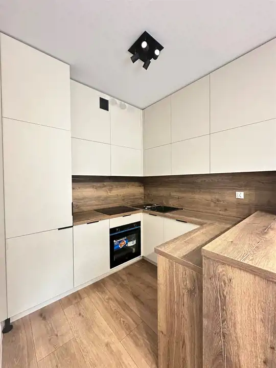 Obszerna przestrzeń z zabudową zapewniającą dodatkowe miejsce do przechowywania.