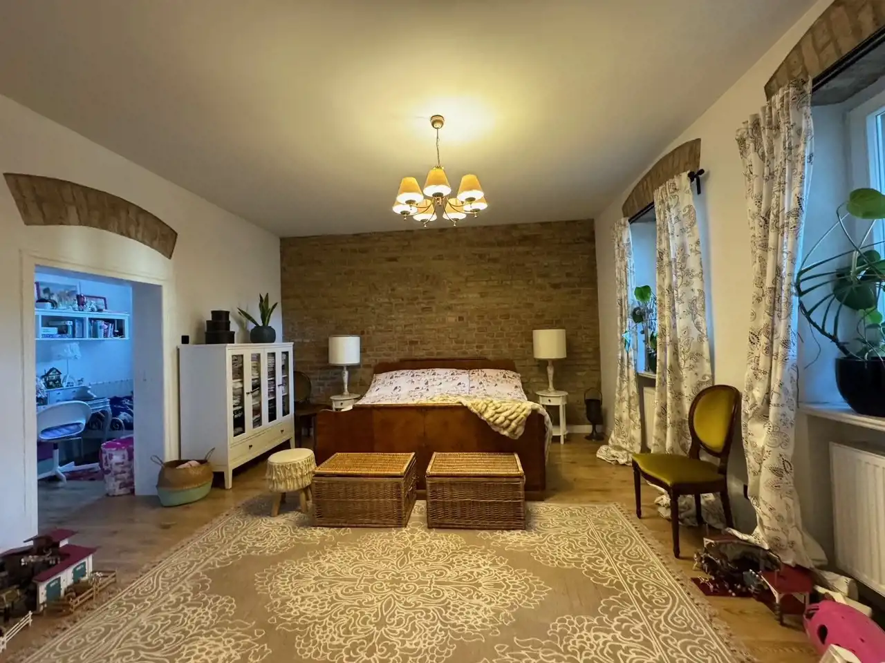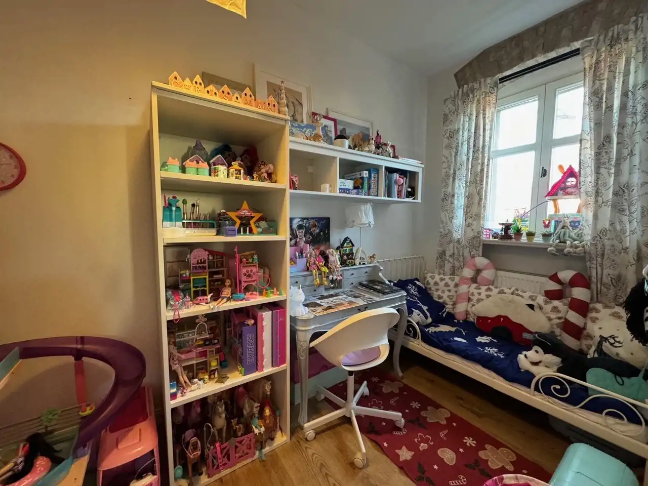 - Garderoba (9,40 m²) z bezpośrednim wejściem z sypialni (obecnie: pokój dziecięcy),