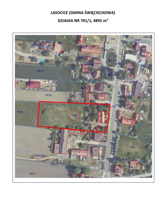 Działka o powierzchni 4 895 m² oferuje ogromny potencjał do zagospodarowania. Znajdują się na niej dom, dwa budynki gospodarcze (łącznie o pow. ok. 39 m²) oraz przestrzeń rekreacyjna.