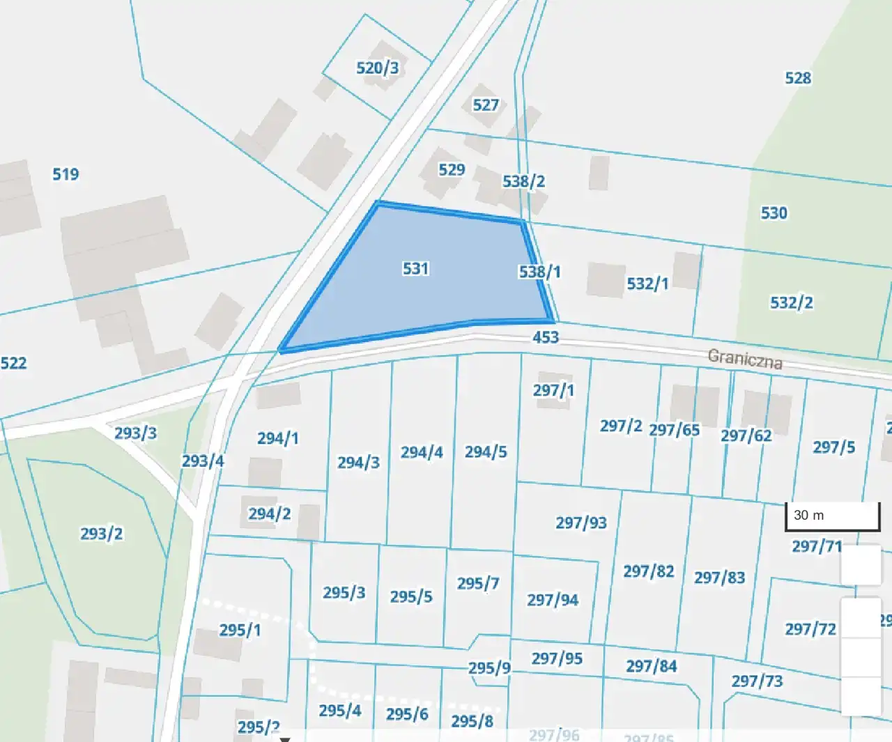 - szerokość frontów: 56 m i 86 m (działka narożnikowa, dojazd z dwóch głównych ulic: Słonecznej i Granicznej),