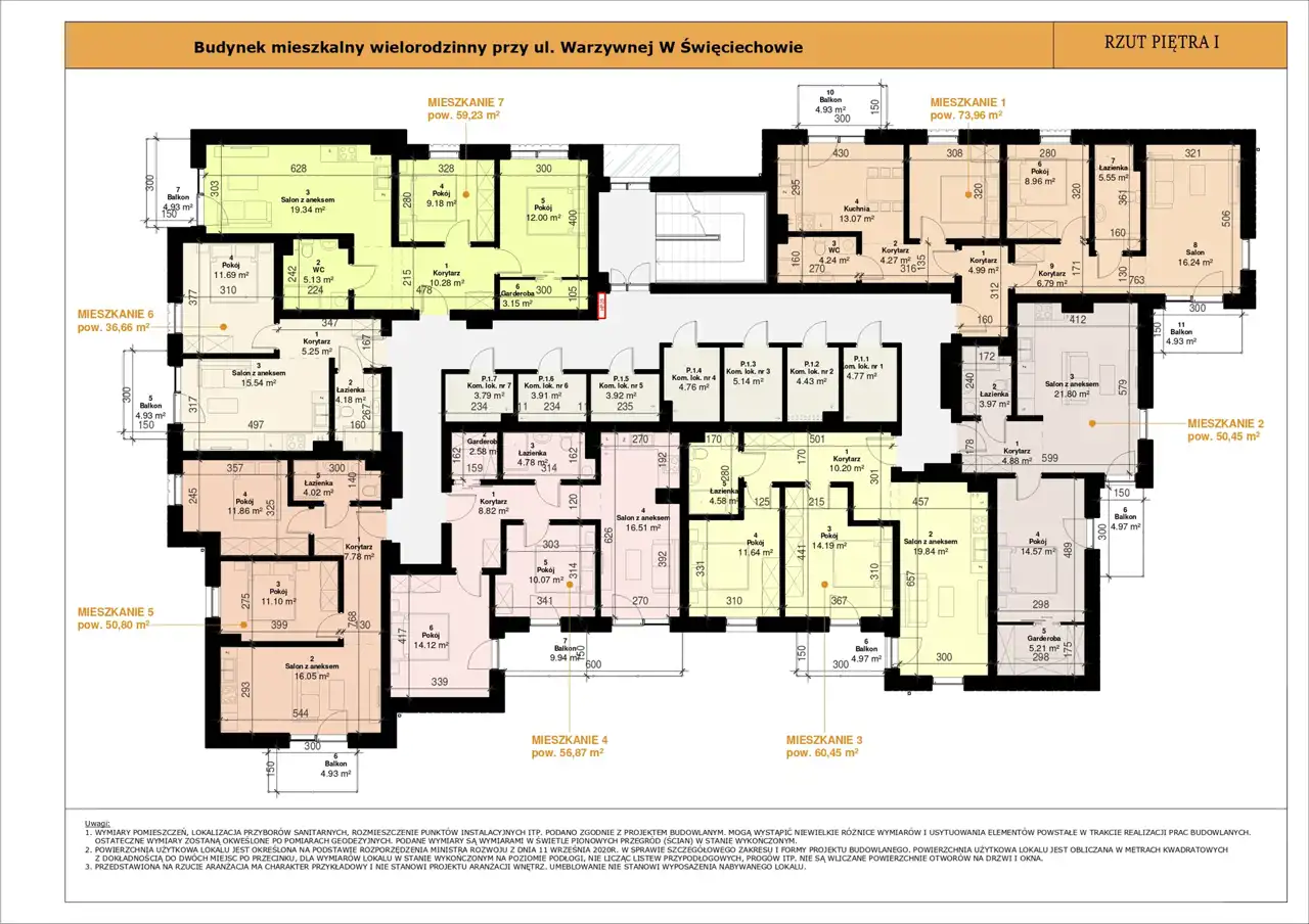 - 7 lokali mieszkalnych - powierzchni: 36,49 m2 - 73,67 m2,