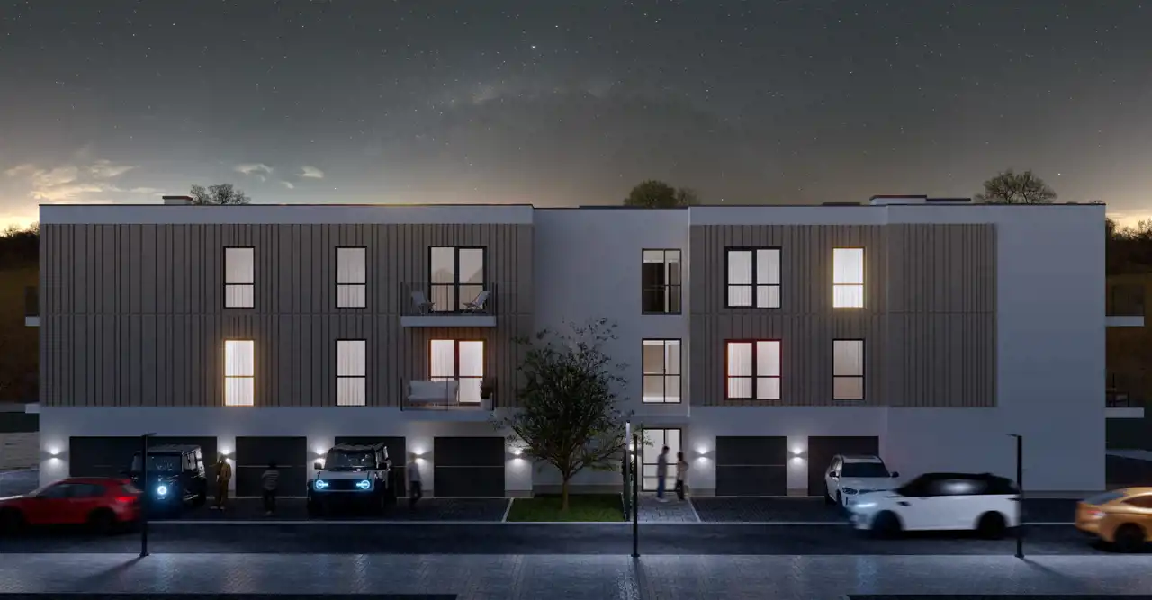 Nowoczesny, kameralny, dwupiętrowy budynek, w którym zaprojektowano 14 komfortowych lokali mieszkalnych 2 i 3 pokojowych, o zróżnicowanych metrażach, każdy z jednym lub dwoma balkonami. Dodatkowo na każdym z pięter znajdą się komórki lokatorskie, na poziomie parteru natomiast GARAŻE jedno i dwustanowiskowe.