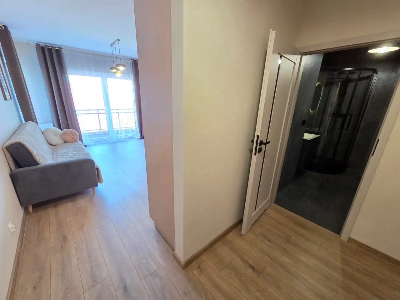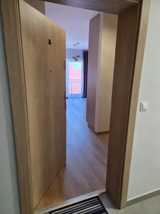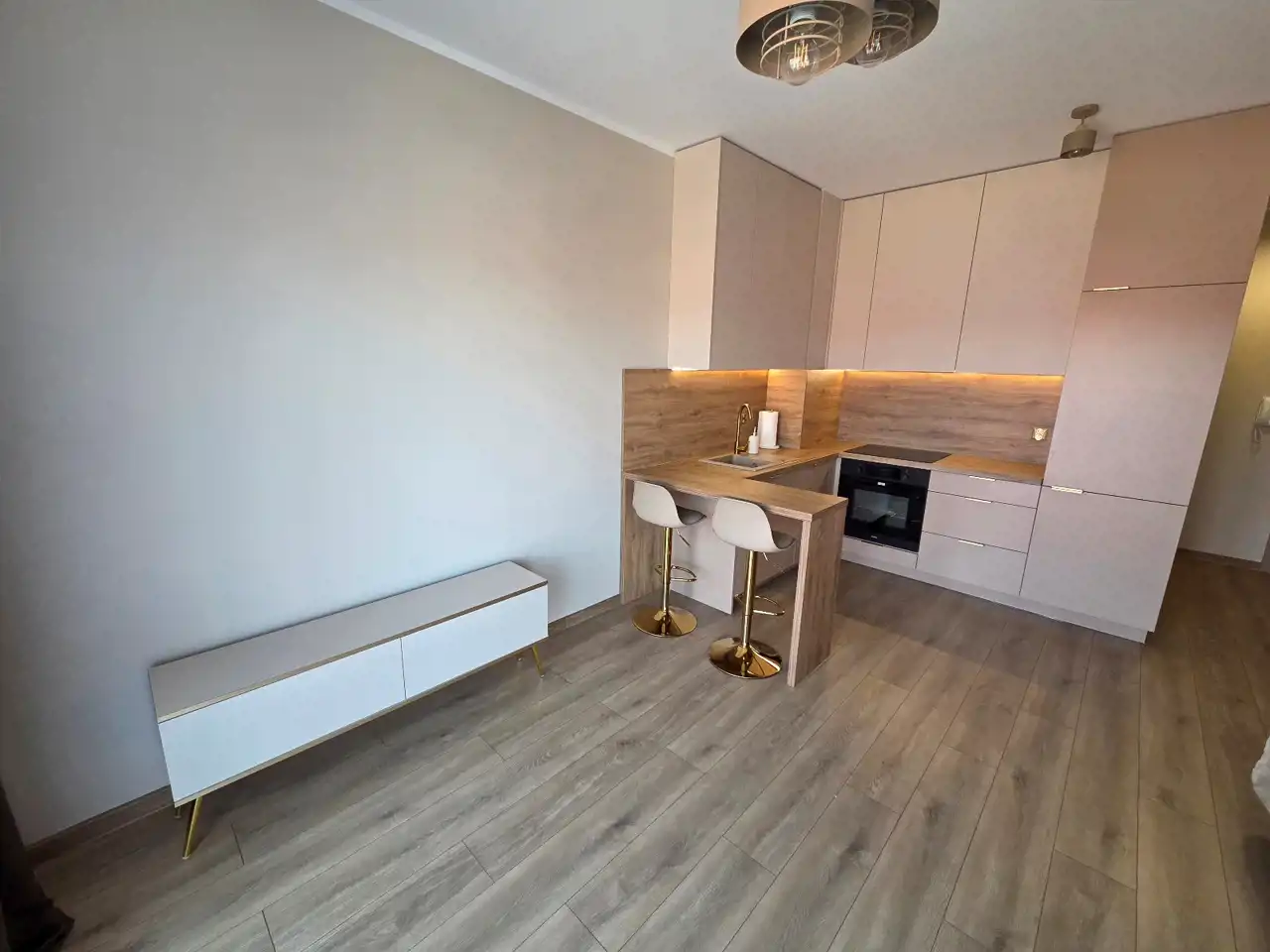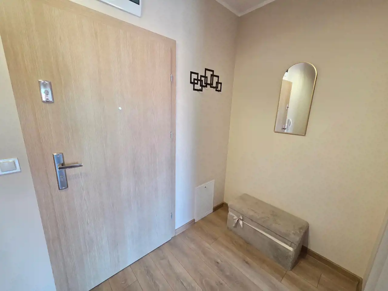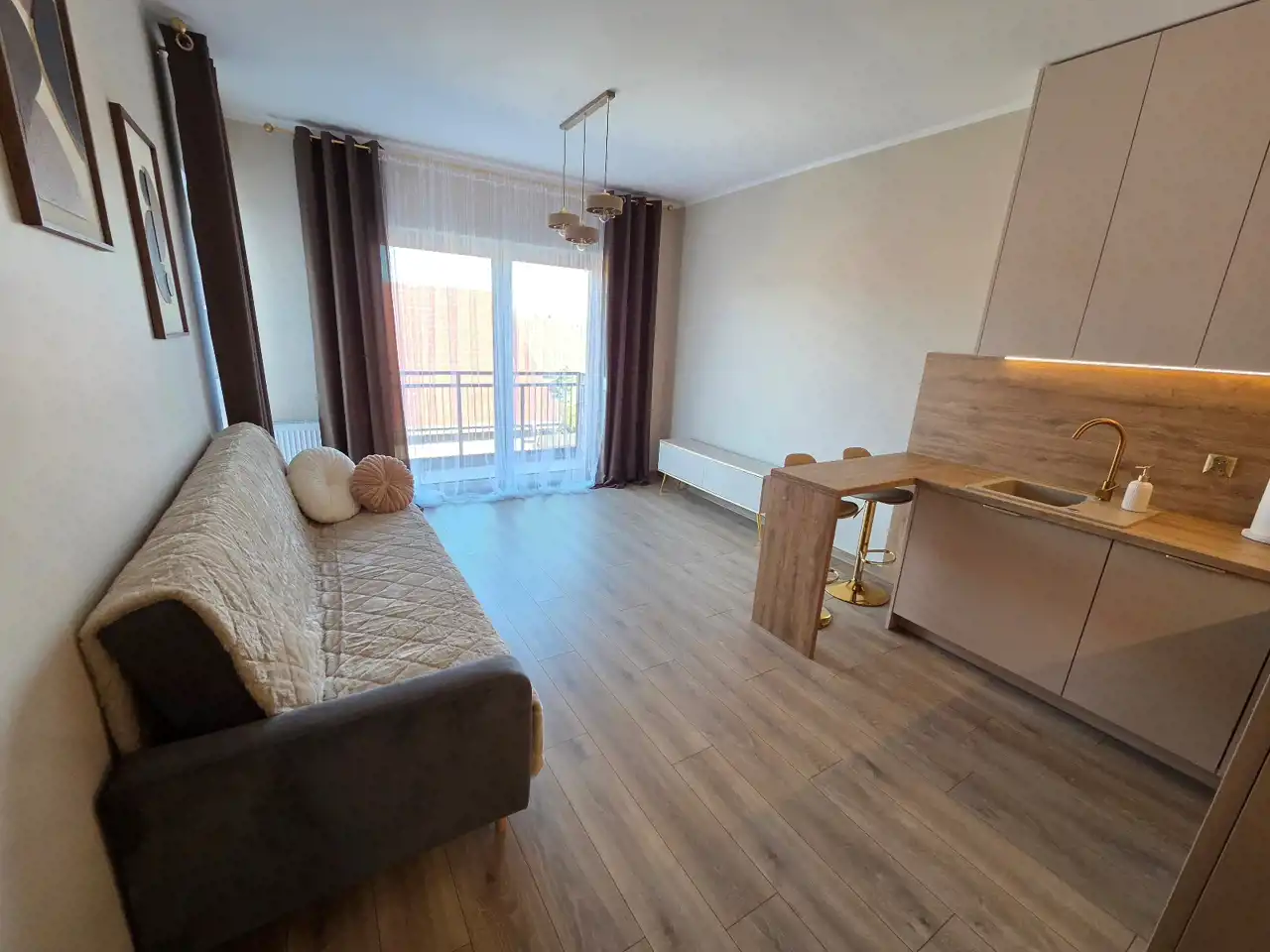 STANDARD WYKOŃCZENIA WNĘTRZA - wysoki: ściany w pokojach i na przedpokoju gładzone i malowane na kolor beżowy, na podłogach panele. Aneks kuchenny wyposażony w nowoczesną zabudowę w kolorze beżowo - brązowym z dodatkami w kolorze złotym, wyposażony w sprzęt AGD (lodówko - zamrażarka, płyta indukcyjna, pochłaniacz, piekarnik elektryczny, zmywarka, zlewozmywak). Dodatkowo na wyposażeniu kuchni 2 hokery. Łazienka wykończona w wysokim standardzie, wyłożona wysokogatunkowymi płytkami ceramicznymi, wyposażona w kabinę prysznicową, podwieszaną umywalkę z szufladami, toaletę oraz lustro z podświetleniem LED. W mieszkaniu zamontowane pełne oświetlenie. Drzwi wewnętrzne nowe w kolorze beżowym z przeszkleniem w kolorze czarnym, drzwi zewnętrzne w okleinie drewnianej. Okna PCV dwukolorowe (wewnątrz białe, na zewnątrz brązowe), z roletami zewnętrznymi oraz wewnątrz firany z zasłonami. Na przedpokoju lustro, pufa oraz wieszak na odzież.
