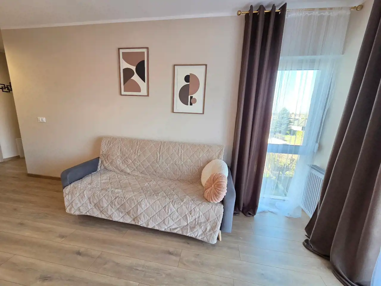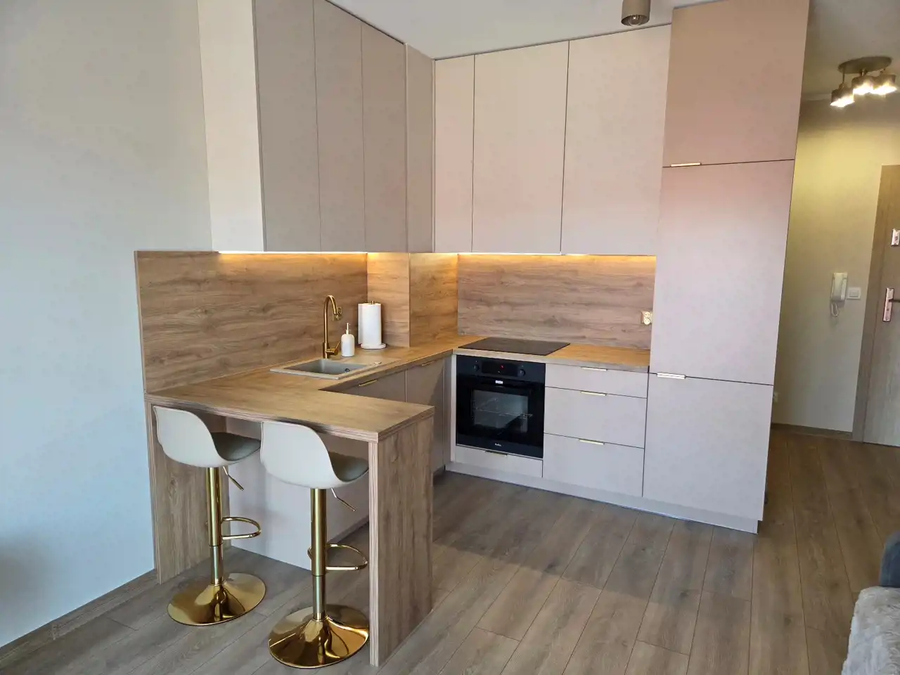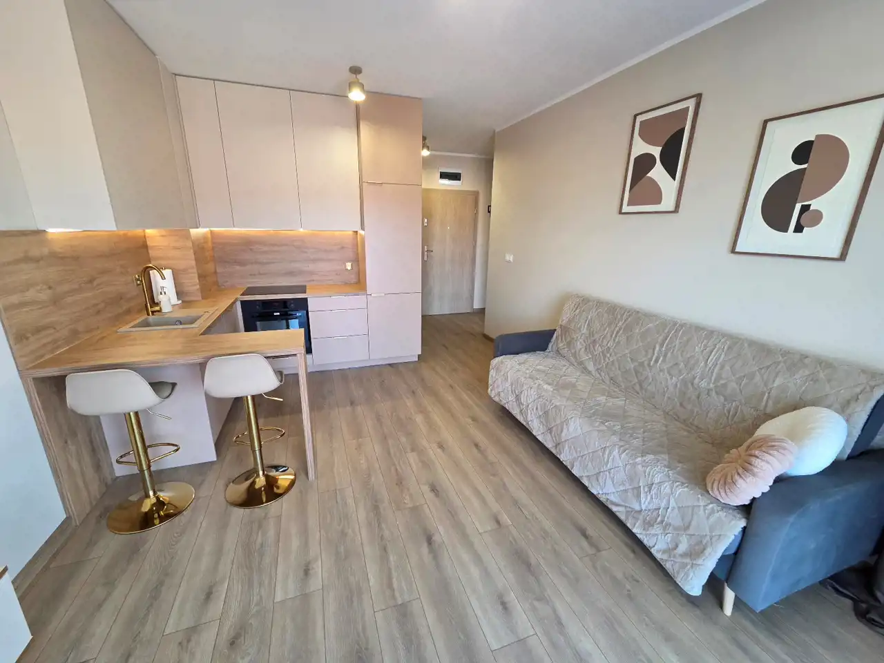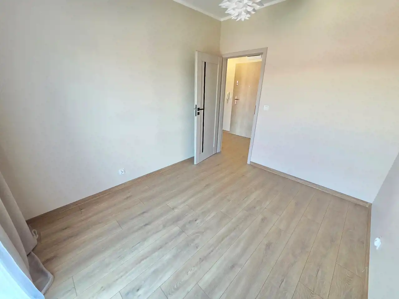 STANDARD WYKOŃCZENIA WNĘTRZA - wysoki: ściany w pokojach i na przedpokoju gładzone i malowane na kolor beżowy, na podłogach panele. Aneks kuchenny wyposażony w nowoczesną zabudowę w kolorze beżowo - brązowym z dodatkami w kolorze złotym, wyposażony w sprzęt AGD (lodówko - zamrażarka, płyta indukcyjna, pochłaniacz, piekarnik elektryczny, zmywarka, zlewozmywak). Dodatkowo na wyposażeniu kuchni 2 hokery. Łazienka wykończona w wysokim standardzie, wyłożona wysokogatunkowymi płytkami ceramicznymi, wyposażona w kabinę prysznicową, podwieszaną umywalkę z szufladami, toaletę oraz lustro z podświetleniem LED. W mieszkaniu zamontowane pełne oświetlenie. Drzwi wewnętrzne nowe w kolorze beżowym z przeszkleniem w kolorze czarnym, drzwi zewnętrzne w okleinie drewnianej. Okna PCV dwukolorowe (wewnątrz białe, na zewnątrz brązowe), z roletami zewnętrznymi oraz wewnątrz firany z zasłonami. Na przedpokoju lustro, pufa oraz wieszak na odzież.