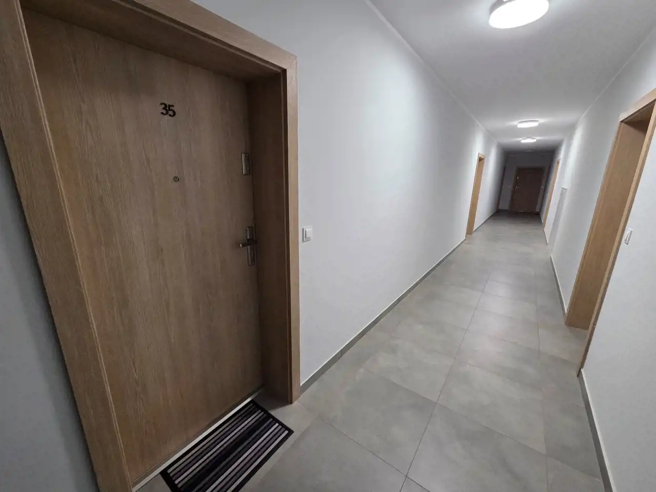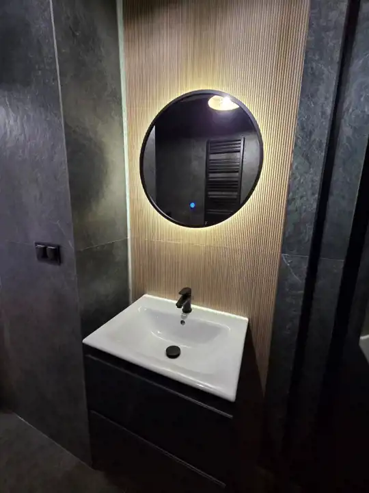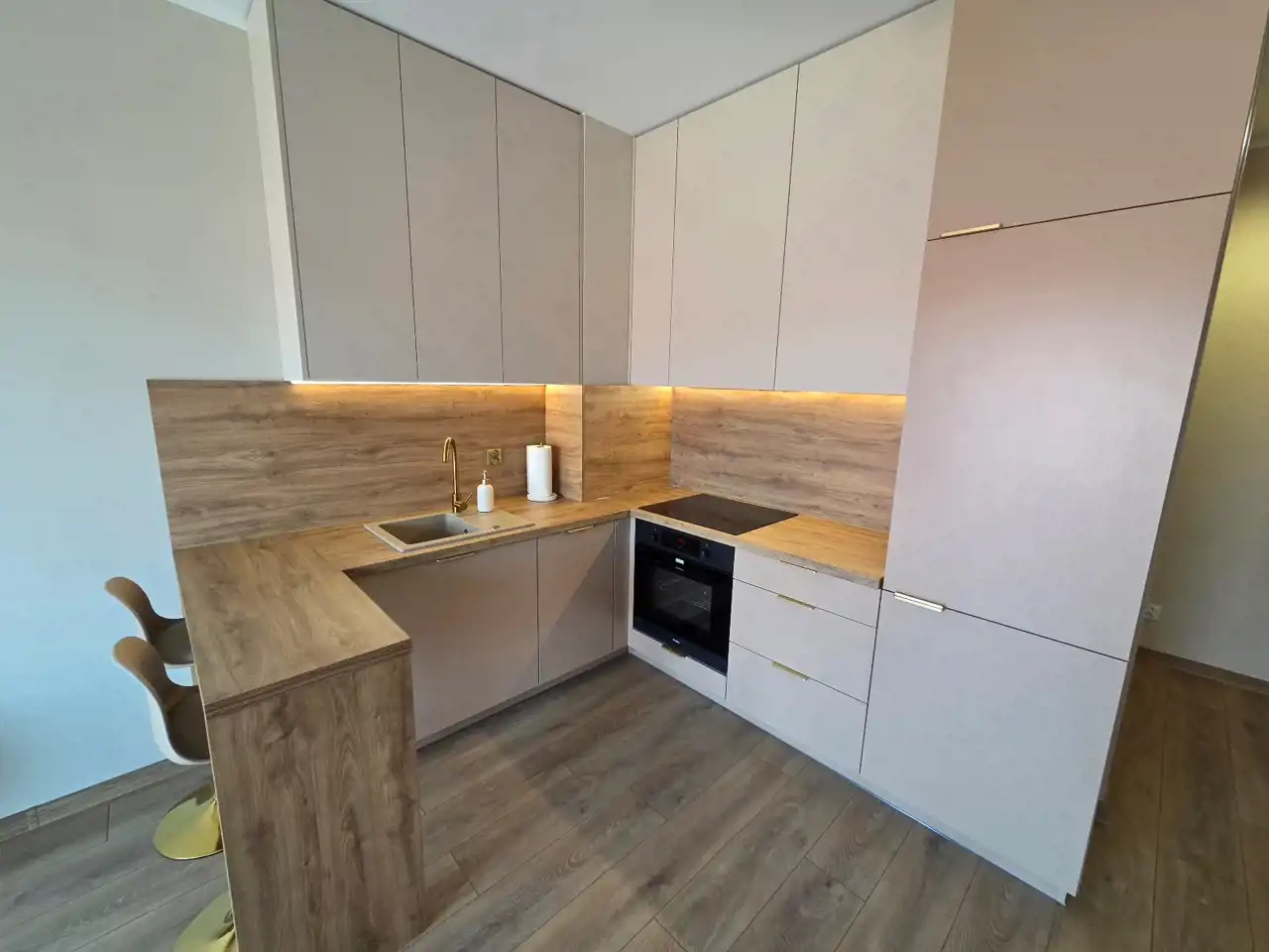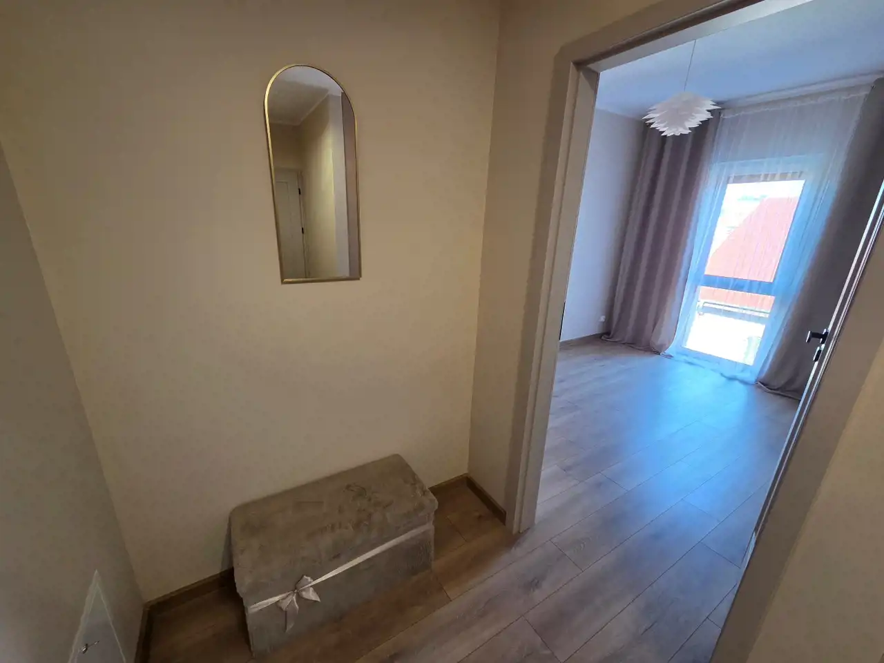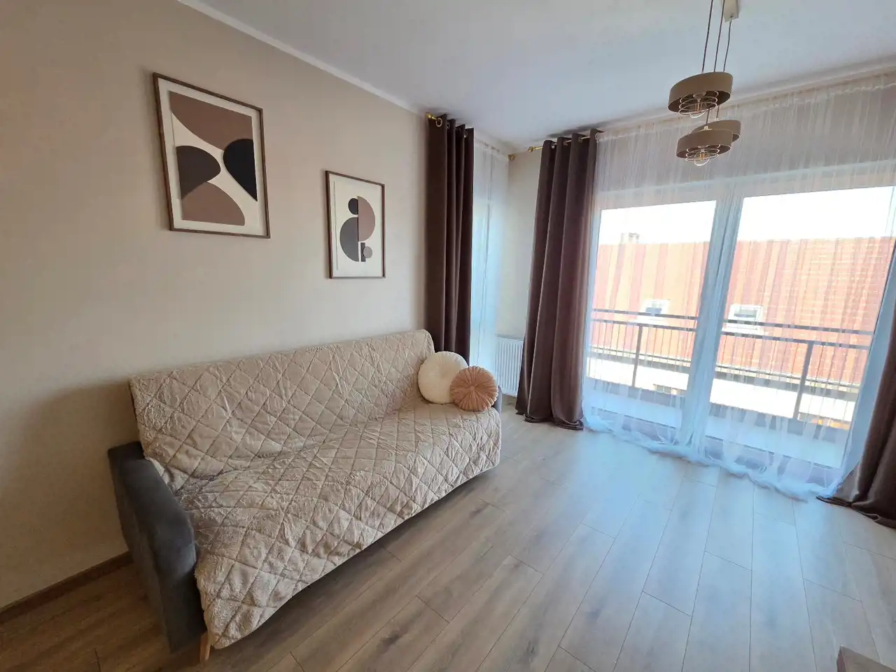 STANDARD WYKOŃCZENIA WNĘTRZA - wysoki: ściany w pokojach i na przedpokoju gładzone i malowane na kolor beżowy, na podłogach panele. Aneks kuchenny wyposażony w nowoczesną zabudowę w kolorze beżowo - brązowym z dodatkami w kolorze złotym, wyposażony w sprzęt AGD (lodówko - zamrażarka, płyta indukcyjna, pochłaniacz, piekarnik elektryczny, zmywarka, zlewozmywak). Dodatkowo na wyposażeniu kuchni 2 hokery. Łazienka wykończona w wysokim standardzie, wyłożona wysokogatunkowymi płytkami ceramicznymi, wyposażona w kabinę prysznicową, podwieszaną umywalkę z szufladami, toaletę oraz lustro z podświetleniem LED. W mieszkaniu zamontowane pełne oświetlenie. Drzwi wewnętrzne nowe w kolorze beżowym z przeszkleniem w kolorze czarnym, drzwi zewnętrzne w okleinie drewnianej. Okna PCV dwukolorowe (wewnątrz białe, na zewnątrz brązowe), z roletami zewnętrznymi oraz wewnątrz firany z zasłonami. Na przedpokoju lustro, pufa oraz wieszak na odzież.
