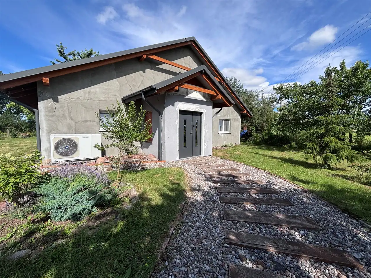 - Media Ogrzewanie: pompa ciepła; Woda: pompa; Kanalizacja: własna oczyszczalnia; Prąd: jest; Gaz: brak