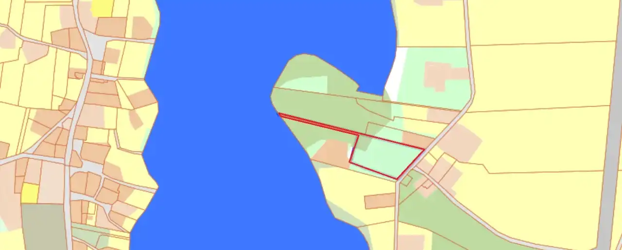 Działka w kształcie trapezu, z własnym dojściem do jeziora ok. 150m. Przy działce dostępne media: woda, prąd. Dojazd do działki drogą asfaltową.