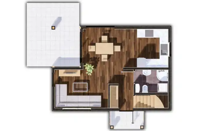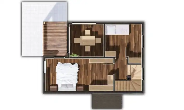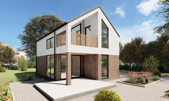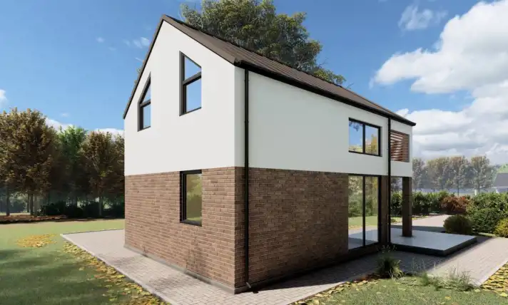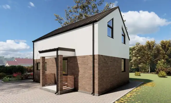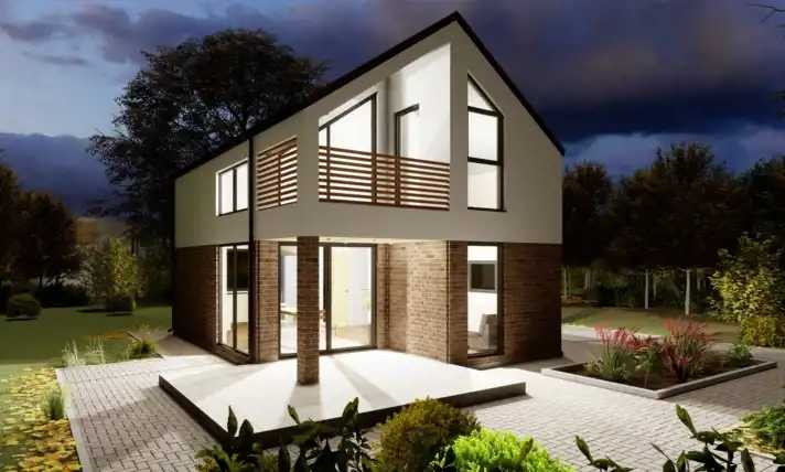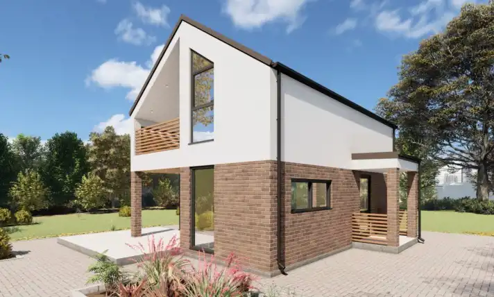 Dom o powierzchni 77,7 m² to nowoczesne rozwiązanie dla rodzin. Posiada dwie przytulne sypialnie, które oferują wygodę i możliwości aranżacyjne. Przestronny salon, połączony z kuchnią, tworzy idealną przestrzeń do wspólnego spędzania czasu. W pełni wyposażona kuchnia zapewnia komfort gotowania. Salon z antresolą i dużymi przeszkleniami zapewnia kontakt z otaczającą naturą. Doskonały wybór dla tych, którzy szukają funkcjonalnego i estetycznego domu, taniego i ekologicznego w utrzymaniu w wyjątkowym, zacisznym miejscu w pobliżu terenów rekreacyjnych, jeziora, lasu.
