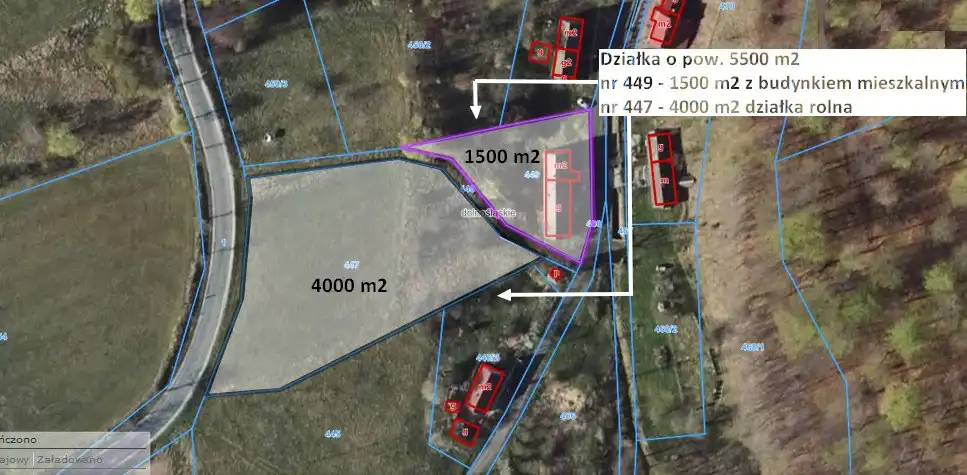 Na działce 449 posadowiony budynek mieszkalny połączony z budynkiem gospodarczym o łącznej pow. 128 m2. Do nieruchomości doprowadzona woda oraz prąd. Działka jest lekko nachylona w kierunku południowym z rozległym widokiem na Pogórze Kaczawskie.