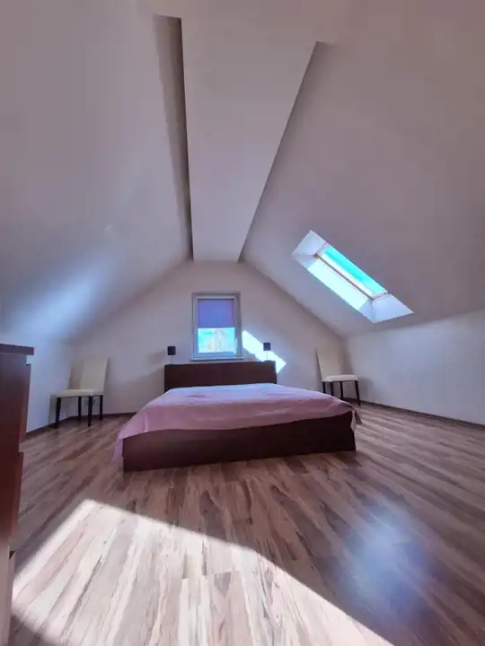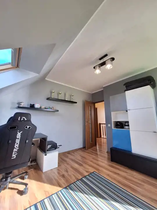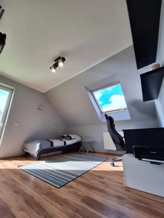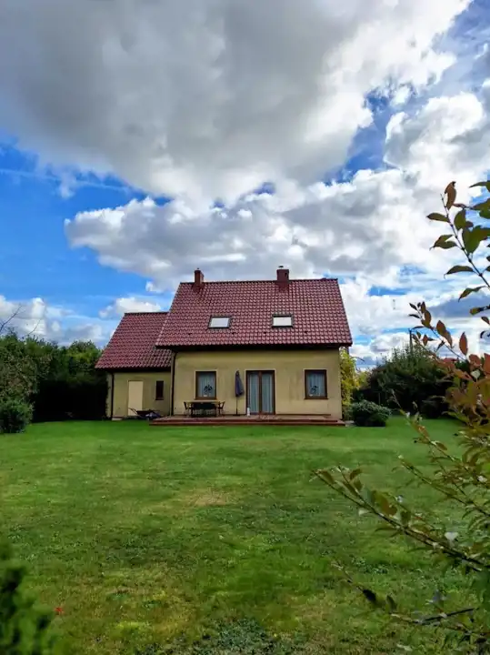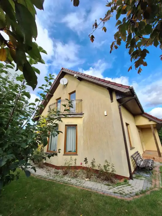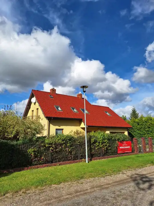 Dom wolnostojący ( około 145m2 ) zbudowany w 2006 roku oddany w 2007. Projekt domu: "gl-124-fistaszek" w projekcie zmiany - brak ściany w salonie oraz powiększenie garażu do 4m, garderoba w sypialni. Ściany zewnętrzne porotherm 24 +styropian. Prostokątna działka ( około 1000m2 ) z dużym potencjałem ok 30 m długości za domem. Dom funkcjonujący i bardzo funkcjonalny gotowy do zamieszkania, podzielony na strefy: dzienną (salon, wydzielona jadalnia i kuchnia oraz mała łazienka) oraz cześć dla domowników na poddaszu użytkowym (dwa pokoje, sypialnia z pokojem i garderobą oraz duża łazienka). Przestronny taras od strony zachodniej na całej szerokości domu (ok 32m2).