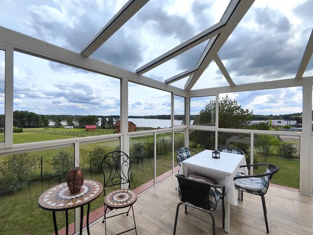 Budynek składa się z parteru oraz poddasza. Na parterze znajduje się komfortowy salon z jadalnią (29 m2) otwarty na kuchnię (11 m2), z którego jest bezpośrednie wyjście na klimatyczny, przeszklony taras (30 m2) z malowniczym widokiem na Jezioro Dudeckie oraz panoramę okolicy. Na parterze mieści się również pokój (9m2), wc (2 m2), hol (12 m2) oraz wiatrołap (3 m2).