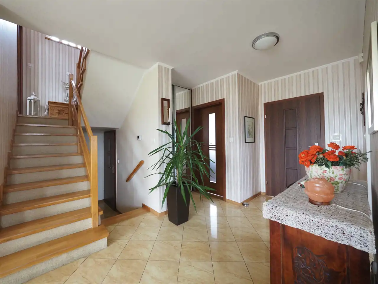 Podłogi w domu wyłożone są panelami, natomiast w łazienkach, garderobie oraz holu terakotą. Kuchnia pod zabudowę wyposażona w niezbędny sprzęt AGD. Dom gotowy do zamieszkania, nie wymaga żadnych nakładów finansowych.