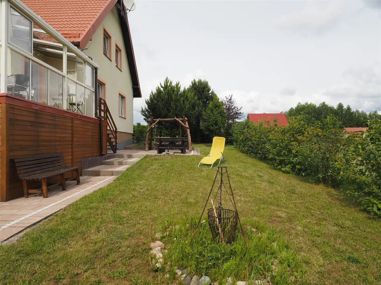 Wizytówką nieruchomości jest niewątpliwie piękny i zagospodarowany ogród. Działka dookoła obsadzona jest świerkami oraz drzewkami zarówno ozdobnymi jak również owocowymi, co w przyszłości zapewni komfort i prywatność.