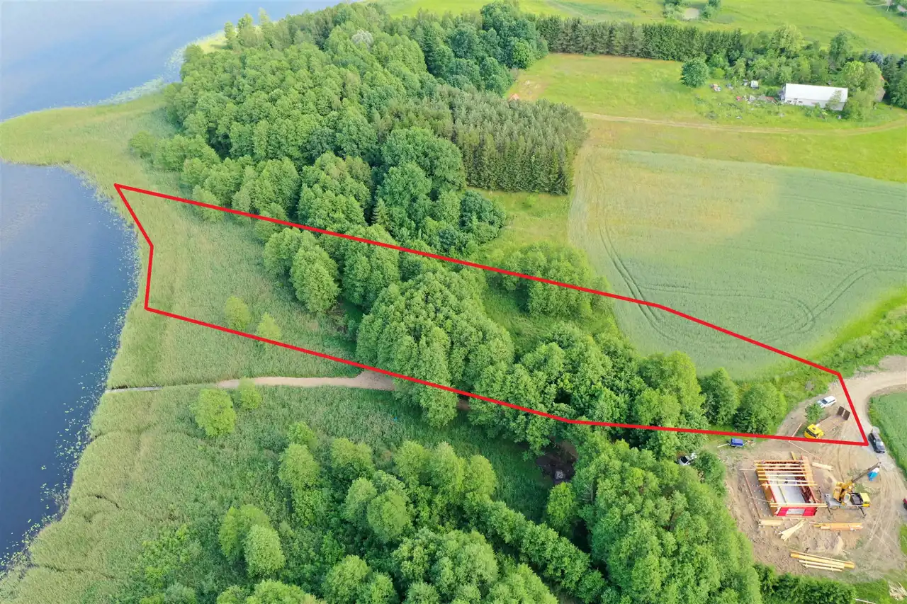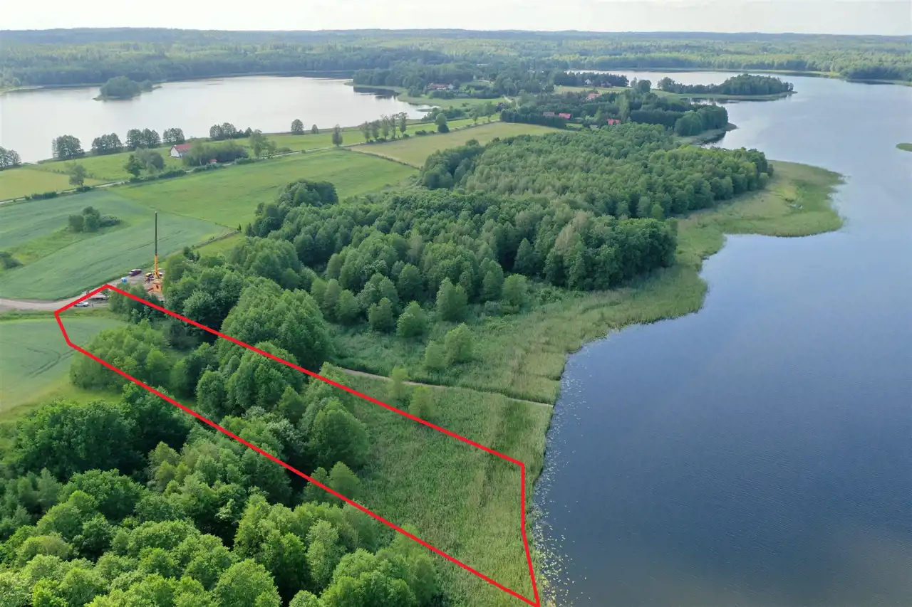Na sprzedaż działka budowlana o powierzchni 5200 m2 z własną 45 metrową linią brzegową jeziora Łaźno, położona w miejscowości Borki.