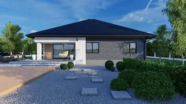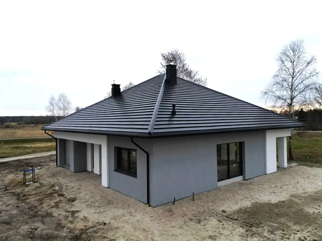 Dach: dach czterospadowy wykonany z płaskiej, nowoczesnej blachodachówki renomowanej firmy Pruszyński