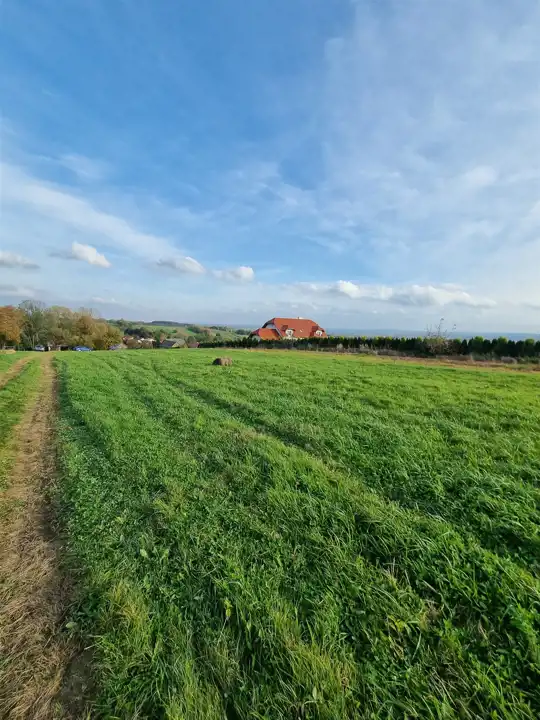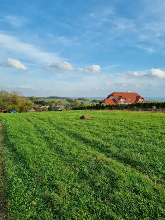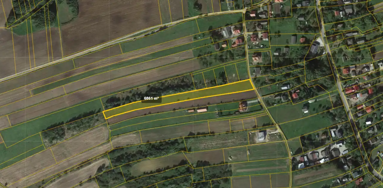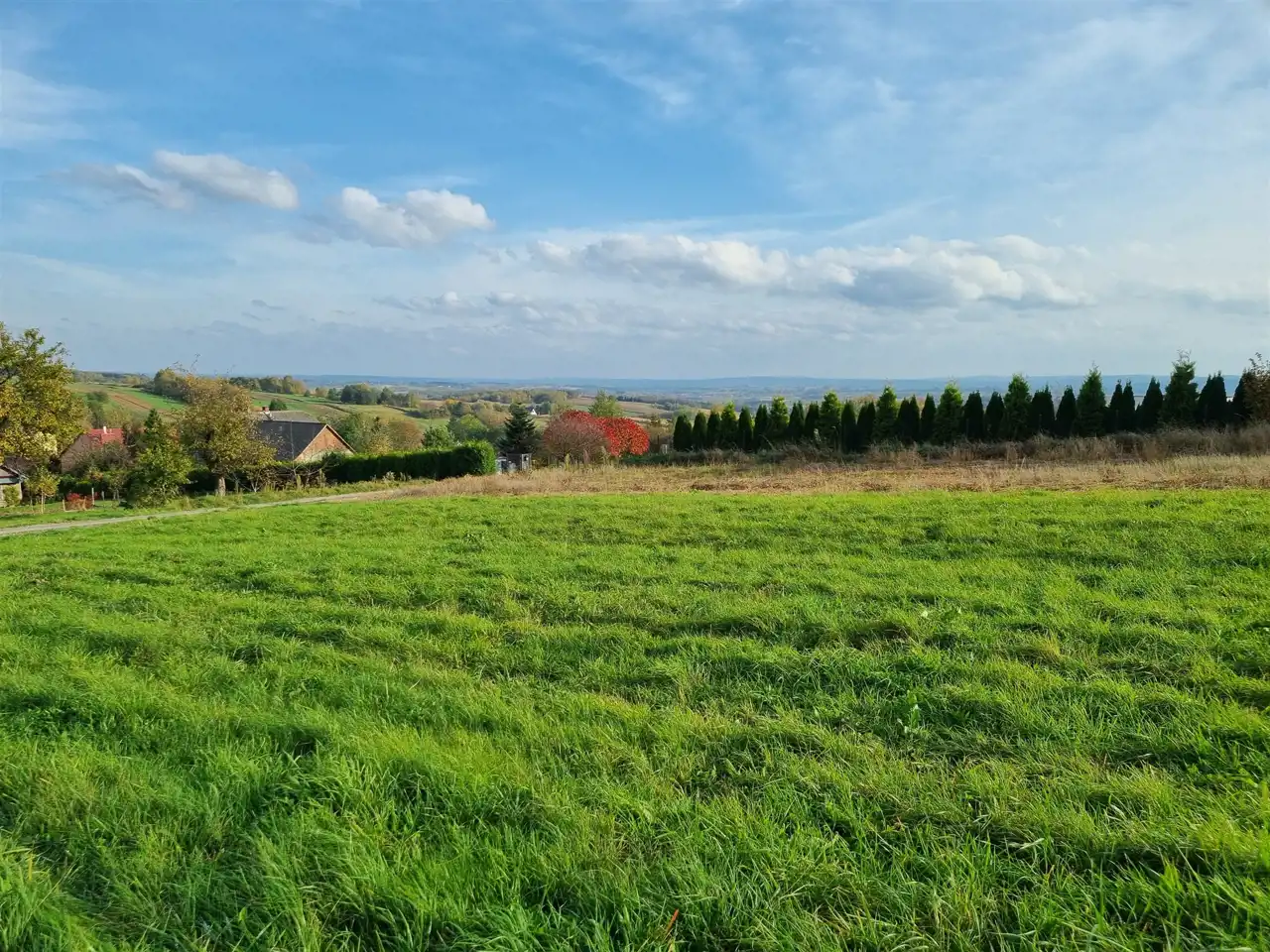 Front działki mierzy 25 metrów i zwęża się ku końcowi działki do 18 metrów, powierzchnia działki to 68,61 ara. Z całej działki rozpościera się piękny widok na okoliczne pola. działka umiejscowiona jest na szczycie wzniesienia.