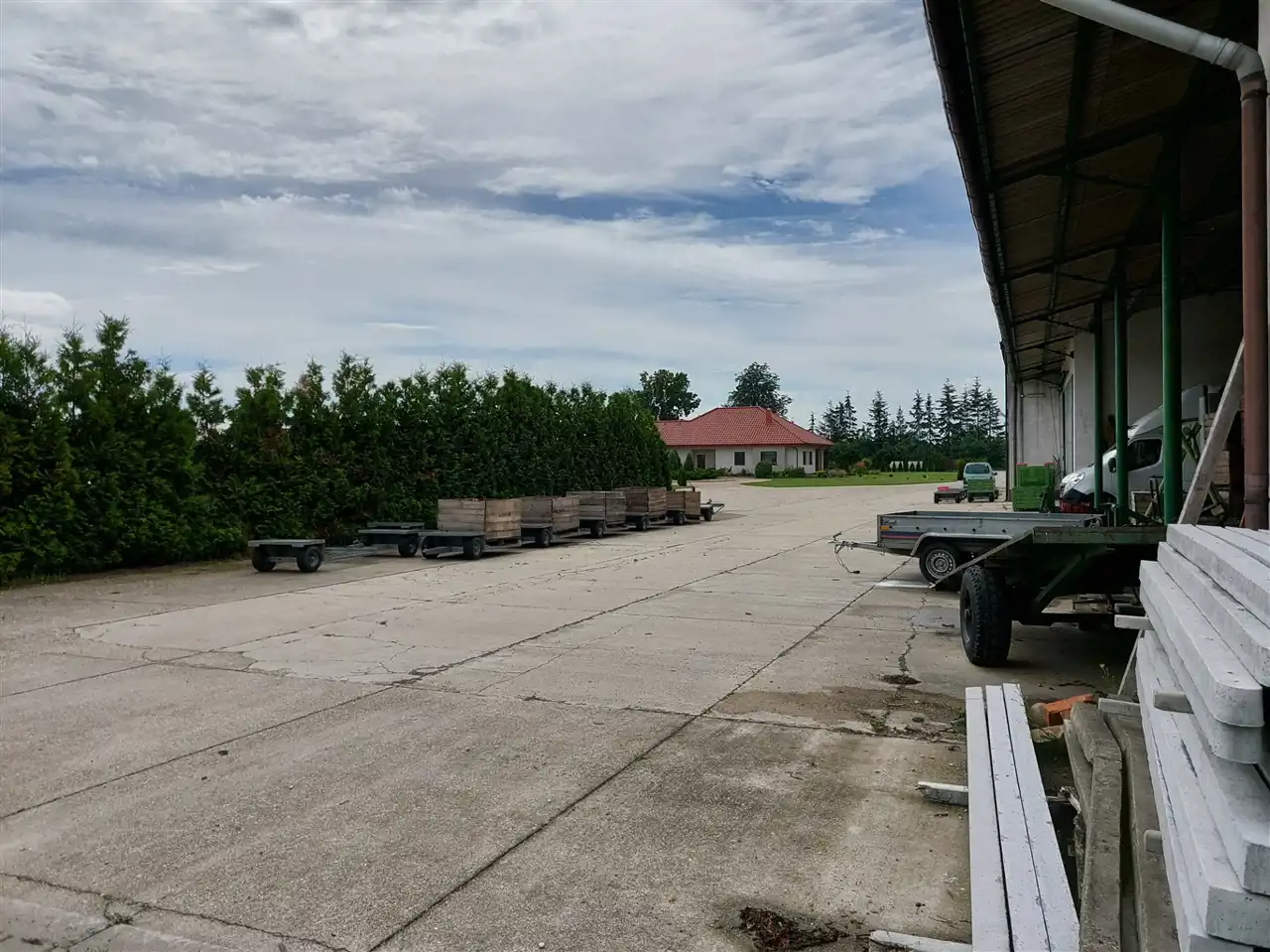Powierzchnia placu 2500 m2. Parking utwardzony z automatyczną bramą wjazdową dla samochodów ciężarowych, rampa z regulowaną wysokością do załadunku towaru.