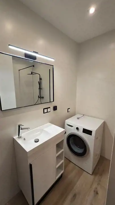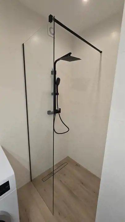 Łazienka: prysznic typu walk-in, elegancka armatura, pralka.