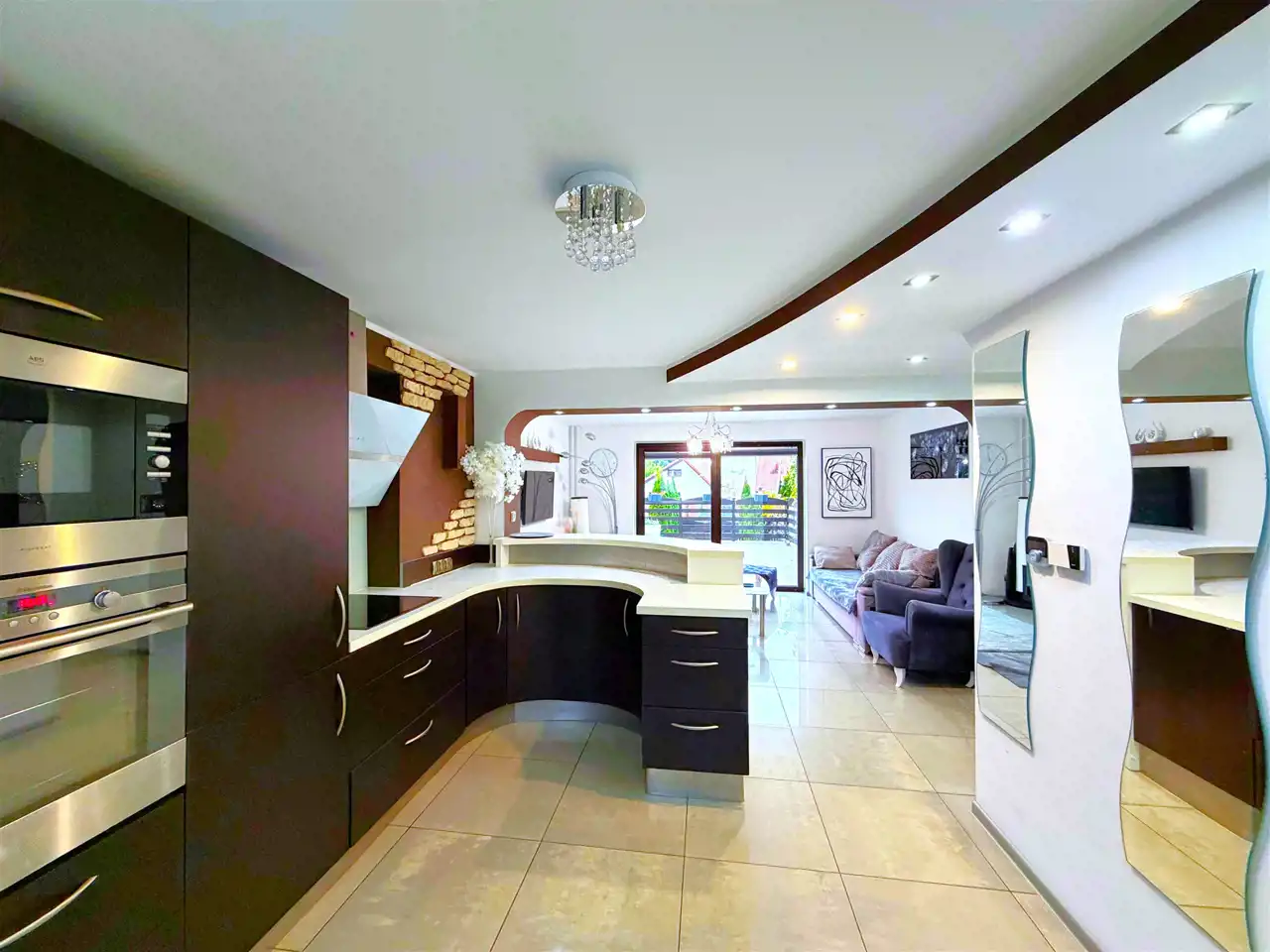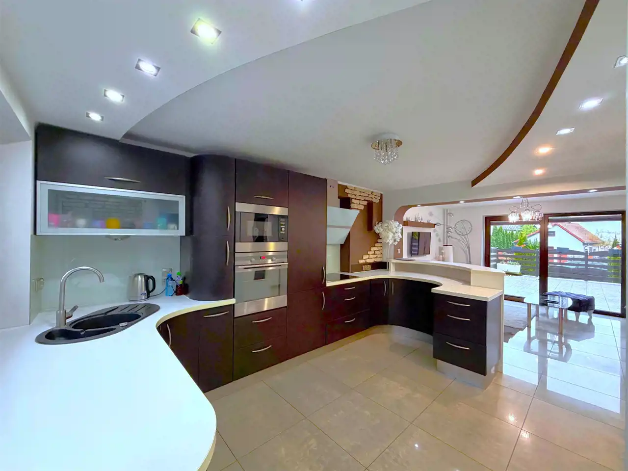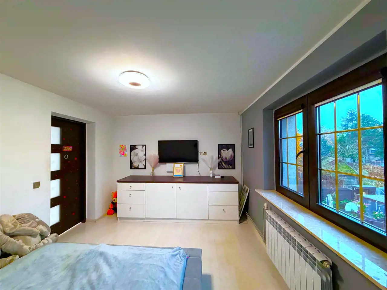 Wewnątrz znajduje się 5 pokoi, łazienka, kuchnia a jasne, przestronne wnętrza z ekspozycją na wschód i zachód gwarantują świetne doświetlenie przez cały dzień. Ogrzewanie zapewnia nowoczesny piec gazowy dwufunkcyjny z ogrzewaniem podłogowym. Niewątpliwym atutem nieruchomości jest podpiwniczenie budynku, w którym obecnie znajduje się pralnia, suszarnia, kolejna łazienka, pomieszczenie, które można określić jako ( przyda się) oraz wejście do garażu.