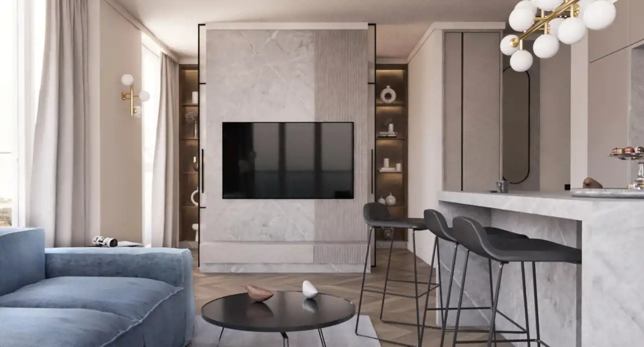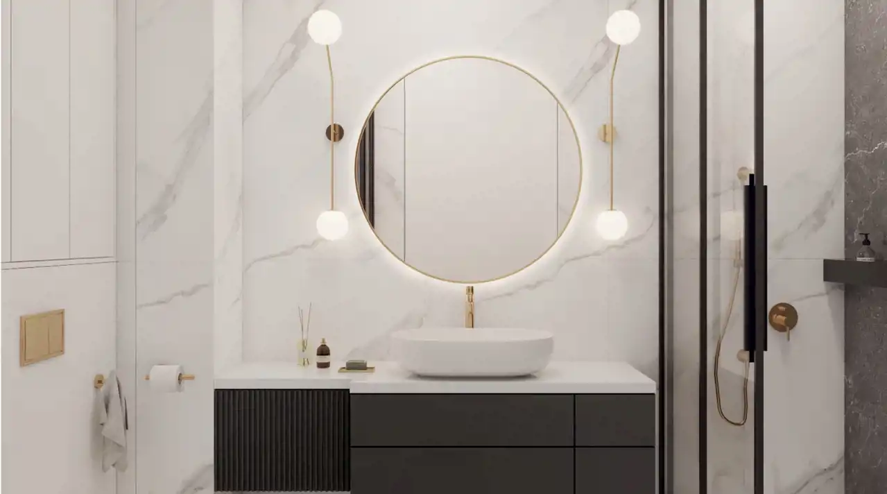 - Wysokiej jakości materiały wykończeniowe (spieki kwarcowe, pozłacane detale)