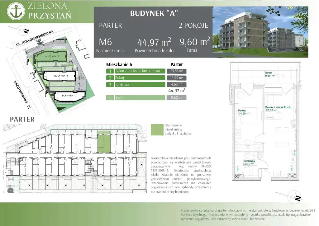 | Nowa Inwestycja w Świnoujściu " ZIELONA PRZYSTAŃ". Lokal mieszkalny położony w Świnoujściu przy ul. Nowokarsiborskiej. Opis inwestycji: Zespół trzech budynków mieszkalnych wielorodzinnych A, B, C z podziemnymi garażami wielostanowiskowymi wraz zagospodarowanym podwórzem. Budynek A zlokalizowany jest bezpośrednio przy ul. Nowokarsiborskiej, budynek B zlokalizowany jest na środku, budynek C zlokalizowany jest w głębi działki. Między budynkami powstały przestrzenie , stropodachy nad garażem, które zagospodarowane zostały jako tarasy przynależne do mieszkań, dojścia do klatek schodowych zlokalizowanych w środkach budynków, a także jako rekreacyjne części wspólne. Wszystkie budynki posiadają 5 kondygnacji nadziemnych oraz jedną kondygnację podziemną. Za budynkiem C będzie zlokalizowany plac zabaw dla dzieci. Przy każdym z wejść do głównych klatek schodowych zlokalizowano miejsca na stojaki na rowery, betonowe siedziska zintegrowane z donicami na zieleń, trabaty żwirowe z wysoką roślinnością oraz śmietniki terenowe. Planowane zakończenie całego projektu, inwestycji do 31.05.2027r. Teren, na którym posadowione są budynki mieszkalne w użytkowaniu wieczystym, w momencie zakupu Umową deweloperską,przed podpisaniem Umowy przeniesienia własności zostanie przekształcone na własność z koniecznością uiszczenia opłaty przekształceniowej przez Nabywcę. Liczba budynków -3 ( w I etapie budynek A) liczba kondygnacji naziemnych -5 Liczba kondygnacji podziemnych -1 Liczba apartamentów A- 74 , B-78, C-71 Liczba planowanych etapów inwestycji : III Ogrzewanie PEC 9 z wewnętrznych węzłów cieplnych indywidualnych dla każdego z budynków) Miejsca postojowe, rodzaj- platforma , zewnętrzne, wewnętrzne. Miejsca postojowe zewnętrzne sprzedawane są na zasadzie prawa do wyłącznego użytkowania części wspólnej. Ilość miejsc postojowych: w halach garażowych: A-60, B-60, C-59, zewnętrzne A-14, B-18, C-12. M6 Opis Powierzchnia: 44,97 m2 taras : 9,60 m2 Apartament składa się z salonu z aneksem: 25,35 m2, pokój : 14,99 m2 łazienki: 4,63 m2 Usytuowanie lokalu w budynku zaznaczono na fotografii. Lokal w stanie dweloperskim, Technologia i standard wykonania budynku do wglądu. Lokal mieszkalny: ściany i sufity: tynkowane tynkiem gipsowym na mokro, ściany łazienek tynkowane tynkiem cementowo-wapiennym drzwi wewnętrzne do lokalu- jednoskrzydłowe, pełne wyposażone w wizjer o podwyższonej odporności na włamanie, mieszkania na parterze wyposażone w rolety zewnętrzne aluminiowe we wszystkich oknach, sterowane elektrycznie. Instalacje- wodno-kanalizacyjna wykonana zgodnie projektem instalacji sanitarnych, z indywidualnymi licznikami-wodomierzami zlokalizowanymi na korytarzach poszczególnych kondygnacji, zakończona podejściami pod projektowane urządzenia sanitarne( bez białego montażu i konstrukcji podwieszenia WC), ciepła woda użytkowa z indywidualnego węzła na budynku PEC. Instalacja C.O. wykonana zgodnie z projektem instalacji sanitarnych, ogrzewanie wodne w systemie zamkniętym, ze źródłem ciepła w postaci węzła cieplnego zasilanego z sieci miejskiej PEC. Instalacja elektryczna wykonana zgodnie z projektem ( ilość gniazd i punktów świetlnych w poszczególnych pomieszczeniach zgodnie z przekazanym planem rozmieszczenia pkt. elektrycznych z i indywidualnym licznikiem, tablicą bezpiecznikową, białym osprzętem w zakresie gniazd i włączników. Instalacja wentylacji wewnątrz lokali mieszkalnych w systemie hybrydowym prowadzona rurami stalowymi w otulinie z wełny mineralnej, zakończona wentylatorami wyciągowymi Uwagi: wykończenie lokali mieszkalnych nie obejmuje ościeżnic i drzwi wewnętrznych, glazury i terrakoty, okładzin podłogowych, szpachlowania i malowania ścian, lamp, żyrandoli, armatury sanitarnej, zabudowy meblowej, kurtyn powietrznych. Deweloper wychodzący naprzeciw indywidualnym potrzebom nabywców dopuszcza możliwość zmian funkcjonalnych polegających na zmianie układu ścian działowych i przeróbek w zakresie instalacji w zgodzie z obowiązującymi normami, aktami prawnymi i sztuką budowlaną. Ewentualna rezygnacja z części prac/wyposażenia wykonywanych w ramach standardu nie wpływają na różnicę w oferowanej cenie lokalu. POWIERZCHNIA MIESZKANIA JAK I POSZCZEGOLNYCH POMIESZCZEŃ SĄ WARTOŚCIAMI PROJEKTOWYMI OSZACOWANYMI WG NORMY PN-ISO 9836:2015-12.OSTATECZNA POWIERZCHNIA LOKALU ZOSTANIE OKREŚLONA NA PODSTAWIE POMIARU POWYKONAWCZEGO. UMEBLOWANIE POMIESZCZEŃ NA WIZUALIZACJI MA CHARAKTER POGLĄDOWY ILUSTRUJĄCY GABARYTY PRZESTRZENI I NIE STANOWI OFERTY HADLOWEJ. CENA PRZEDMIOTOWEGO APARTAMENTU: 589 107 ZŁ BRUTTO , PIĘĆSET OSIEMDZIESIĄT DZIEWIĘĆ TYSIĘCY STO SIEDEM ZŁ. Opis oferty zawarty na stronie internetowej sporządzany jest na podstawie opisu od Dewelopera, może podlegać aktualizacji i nie stanowi oferty określonej w art. 66 i następnych K.C. |