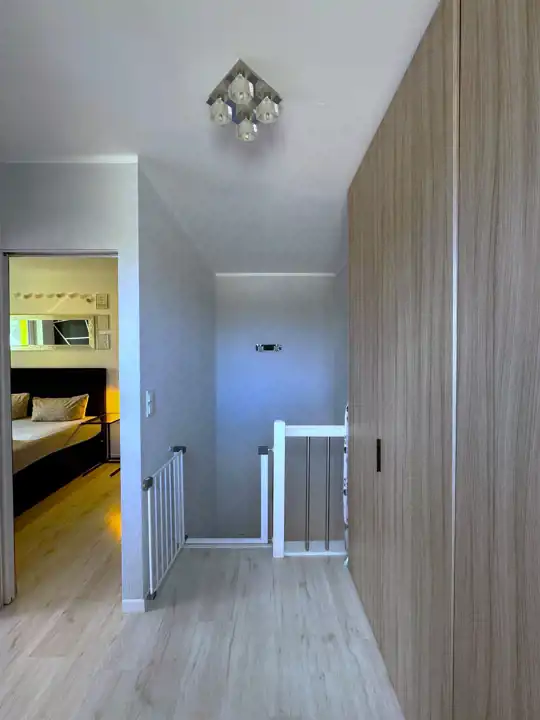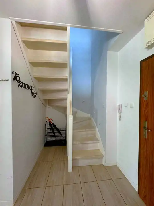 Pierwszy poziom nieruchomości składa się z funkcjonalnej w pełni wyposażonej w sprzęty AGD widnej kuchni z oknem, salonu z bezpośrednim wyjściem na pierwszy z dwóch balkonów, łazienki z wanną oraz WC. Na piętrze, na które prowadzą nas drewniane schody, znajduje się antresola zaadoptowana na dwa oddzielne pokoje, drugi z balkonów oraz hol z szafą w zabudowie.