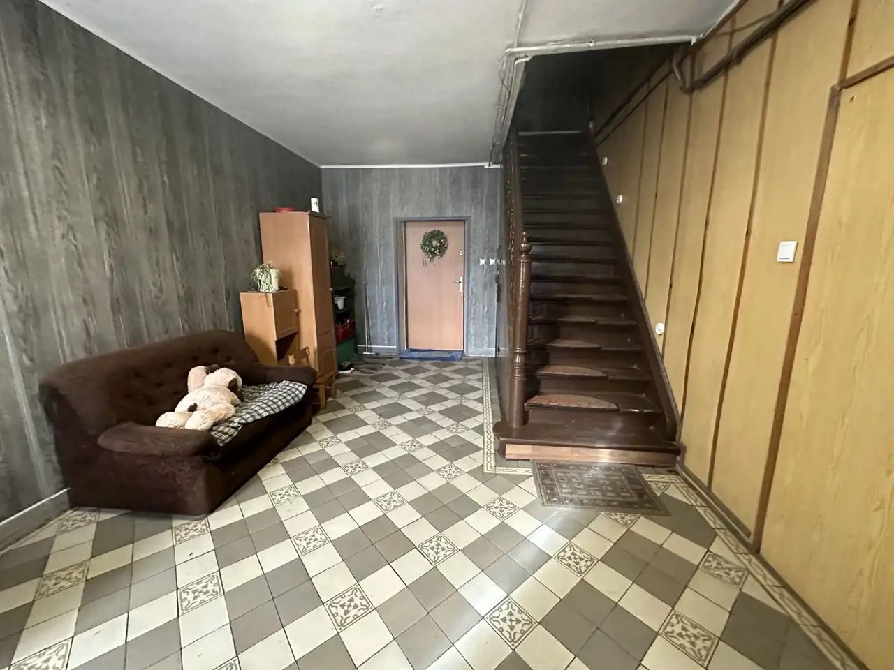 Do budynku prowadzą duże drzwi wejściowe, za którymi znajduje się przestronny hol (23 m²). Choć jest to część wspólna budynku, aktualnie korzystają z niego jedynie właściciele sprzedawanej części. Z holu można dostać się zarówno do mieszkania na parterze, jak i na poddasze, gdzie znajduje się drugie mieszkanie.