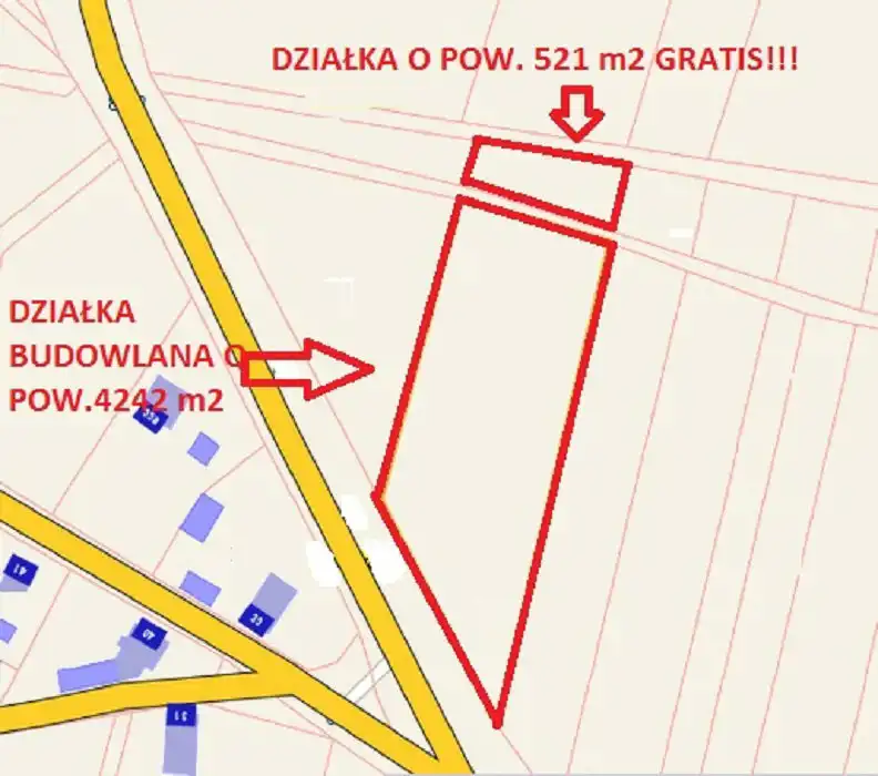 Przedmiotowa nieruchomość składa się z dwóch geodezyjnie wydzielonych działek o powierzchniach 5000 m2 i 450 m2.
