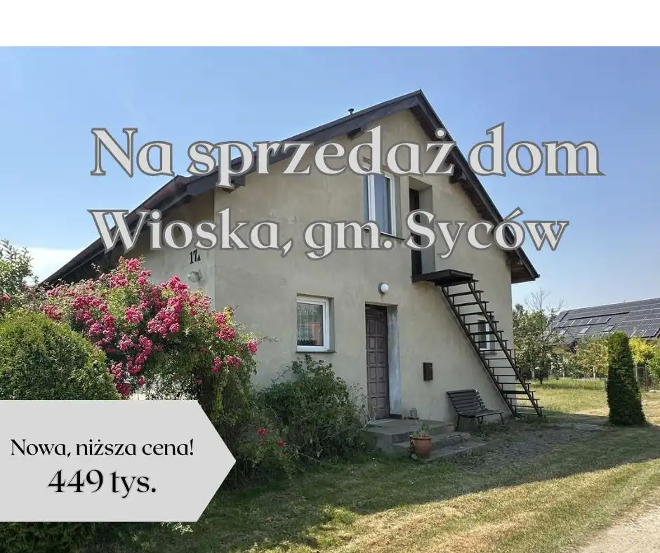 Na sprzedaż urokliwa nieruchomość położona w miejscowości Wioska, w spokojnej okolicy niedaleko Sycowa. Na działce o powierzchni ok. 1500 m² znajduje się wolnostojący dom mieszkalny o powierzchni użytkowej 68 m² oraz budynek gospodarczy.
