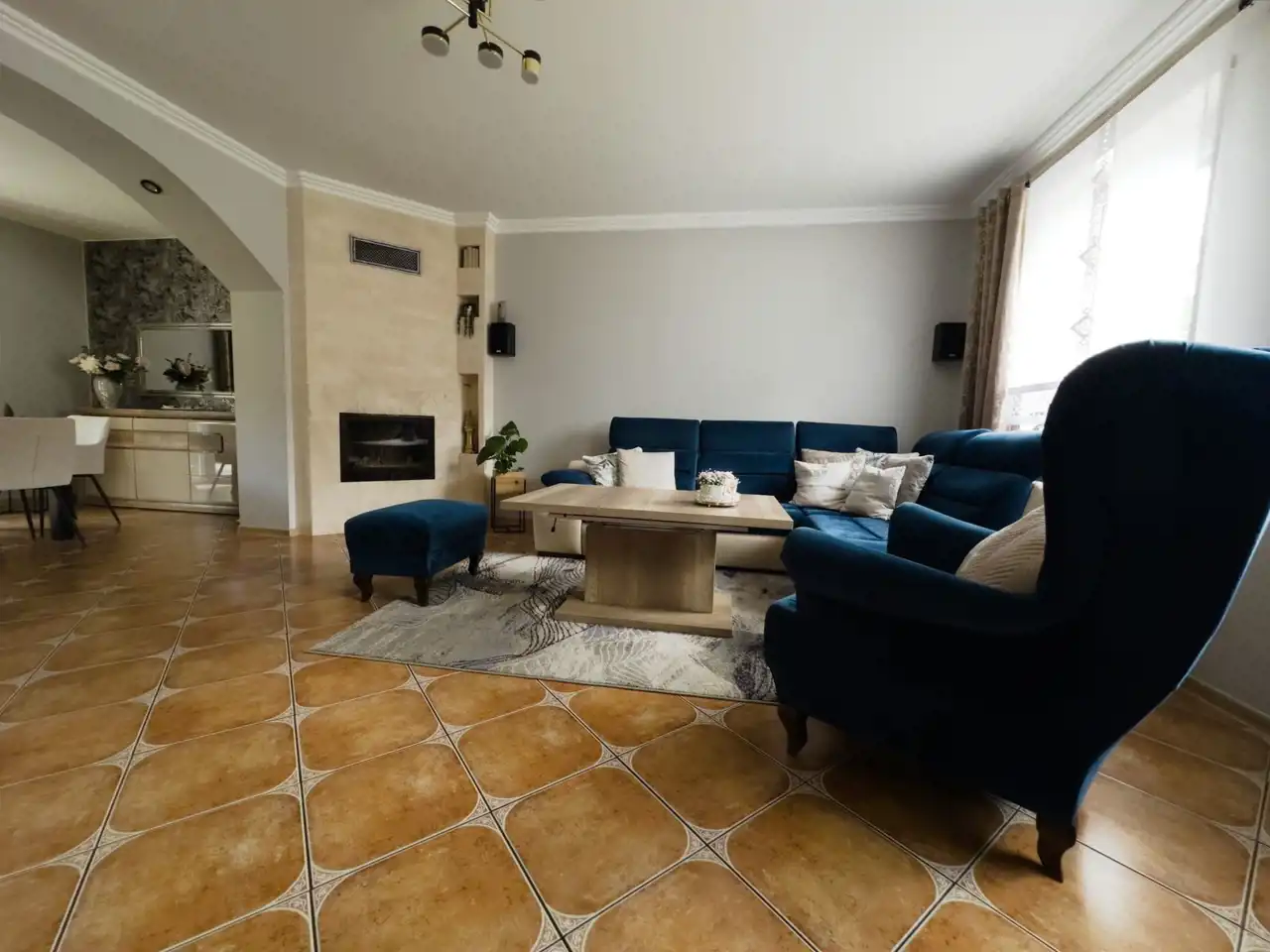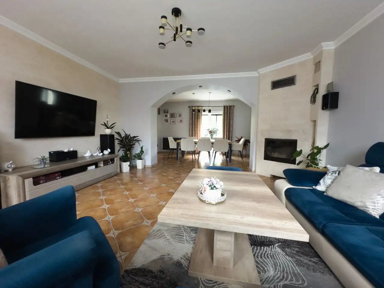 Dom wybudowany z cegły, ocieplony 15 cm styropianem. Elewacja w jasnym kolorze, dach ocieplony 25 cm wełną i pokryty nową dachówką karpiówką (wymienioną rok temu). Okna PCV, rolety zewnętrzne, drzwi antywłamaniowe. Ogrzewanie centralne na pellet oraz kominek z nawiewem mechanicznym.