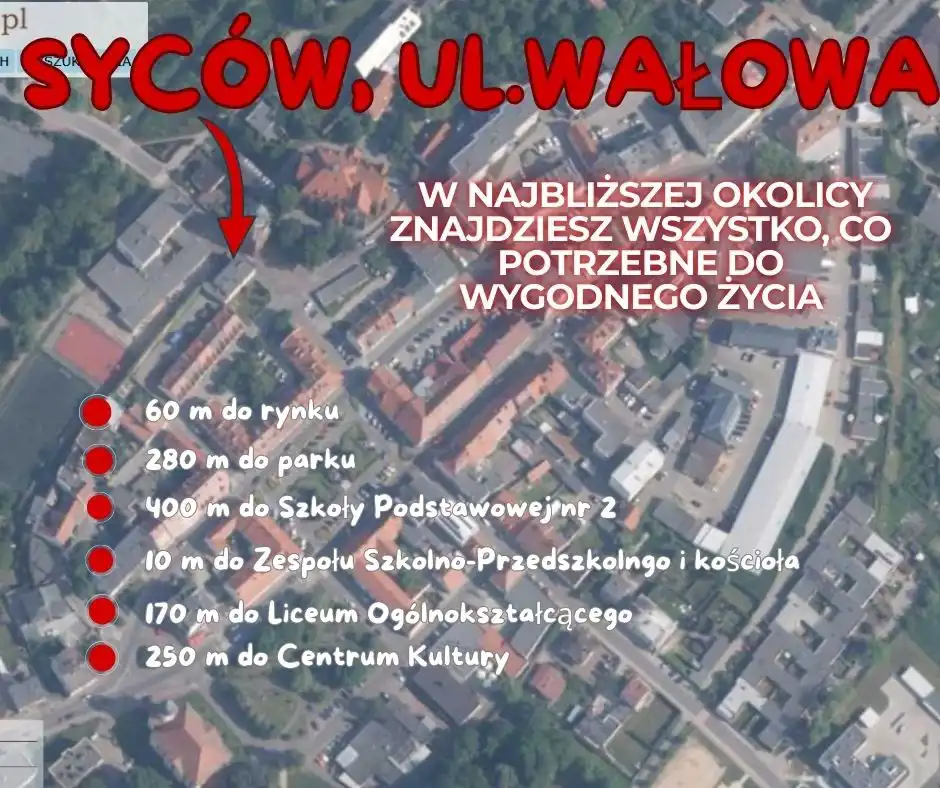 Na sprzedaż mieszkanie o powierzchni 55 m², położone w wyjątkowo dogodnej lokalizacji – przy ul. Wałowej w Sycowie, zaledwie 70 metrów od rynku. Nieruchomość znajduje się na 1. piętrze kameralnego, 2-piętrowego budynku. To idealna propozycja dla osób ceniących sobie bliskość centrum miasta, a jednocześnie spokój i sąsiedzką atmosferę.