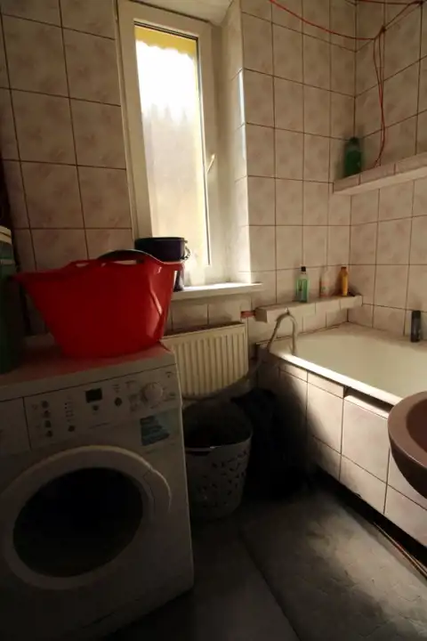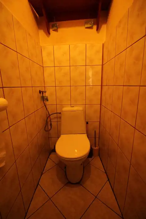 Łazienka i toaleta to dwa oddzielne pomieszczenie. Na wyposażenie łazienki składa się: wanna, umywalka i miejsce na pralkę. Na podłogach i ścianach położone zostały kafle.