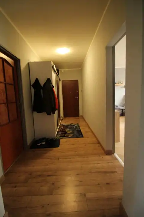Przedpokój stanowi komunikację między wszystkimi pomieszczeniami w lokalu. Jest przestronną i funkcjonalną powierzchnią na której bez problemu mieszczą się 2 szafy do przechowywania okrycia wierzchniego oraz obuwia. Na podłodze położone zostały panele, na ścianach gładź.
