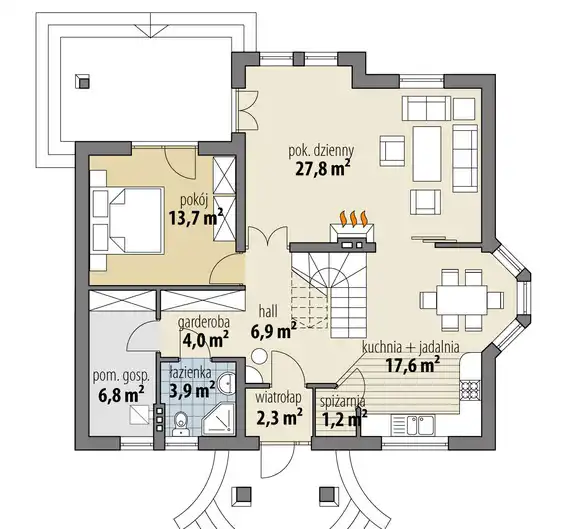 - Kuchnię połączoną z jadalnią (17,60 m²)
