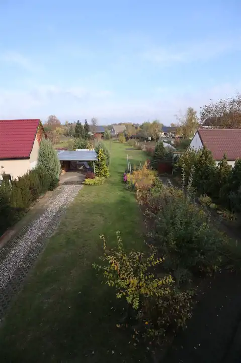 Działka ogrodzona, z zadbanym ogrodem i miejscem na odpoczynek. Przygotowano podest i instalacje pod saunę. Na działce wiata do przechowywania drewna.