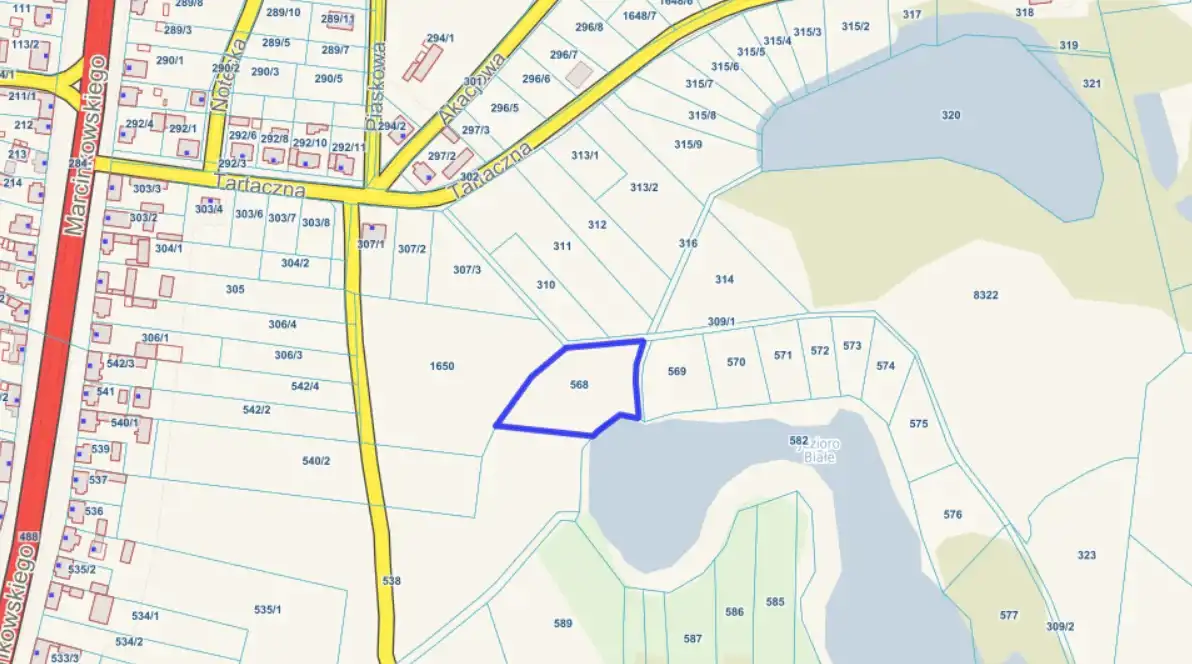 Na sprzedaż malowniczo położona działka gruntu nr 568 o powierzchni 3602 m², z bezpośrednim dostępem do brzegu Jeziora Białego – idealna propozycja dla osób marzących o domu lub letnisku w otoczeniu natury.