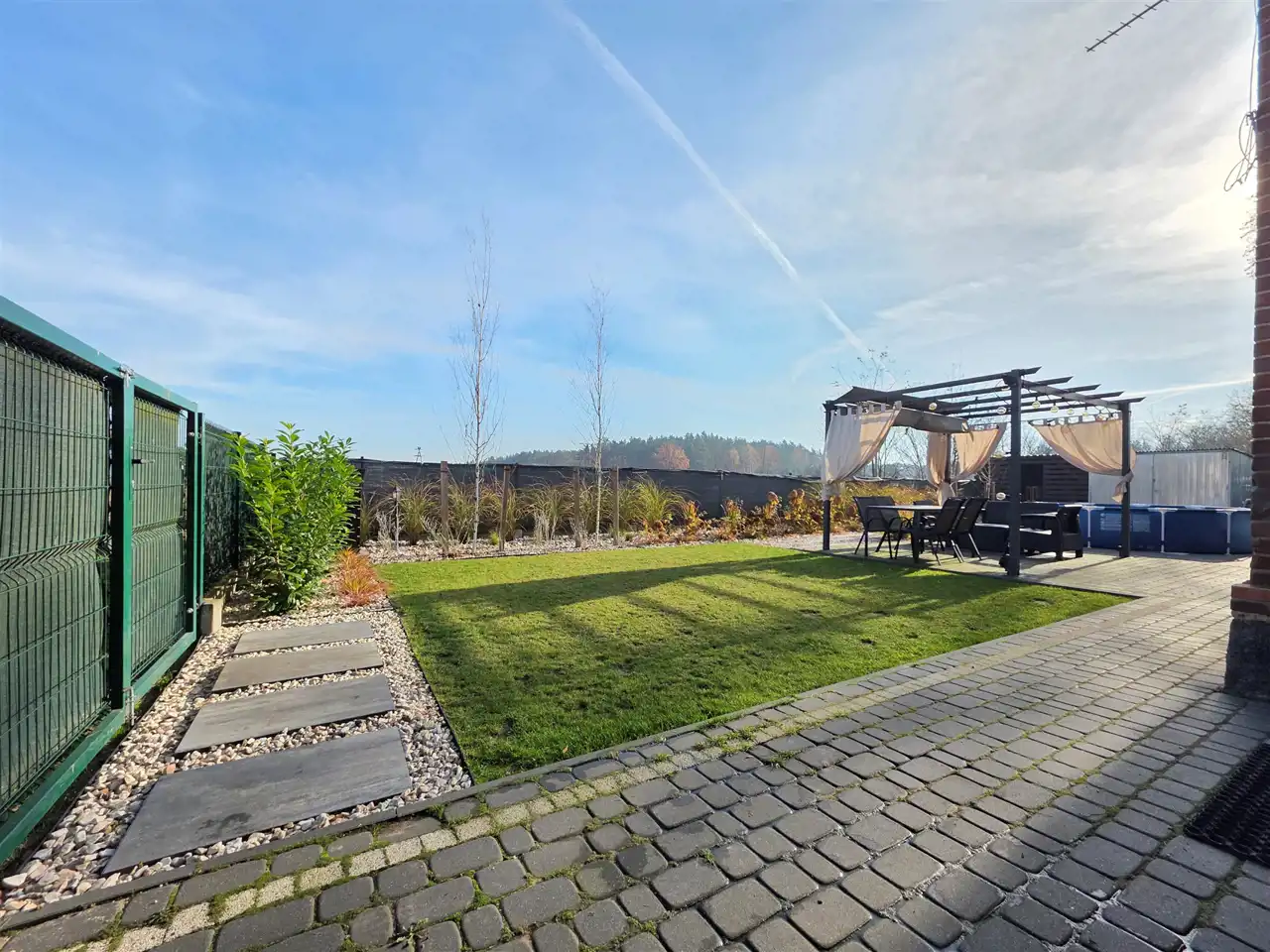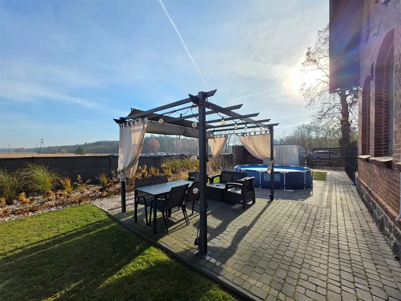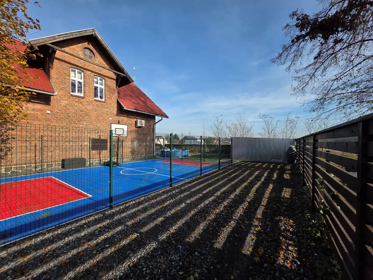 * część prywatna działki (dla właściciela) – piękny, oświetlony ogród z zadbaną roślinnością, pergolą, miejscem do wypoczynku, garażem blaszanym z wiatą na drewno oraz małym boiskiem,