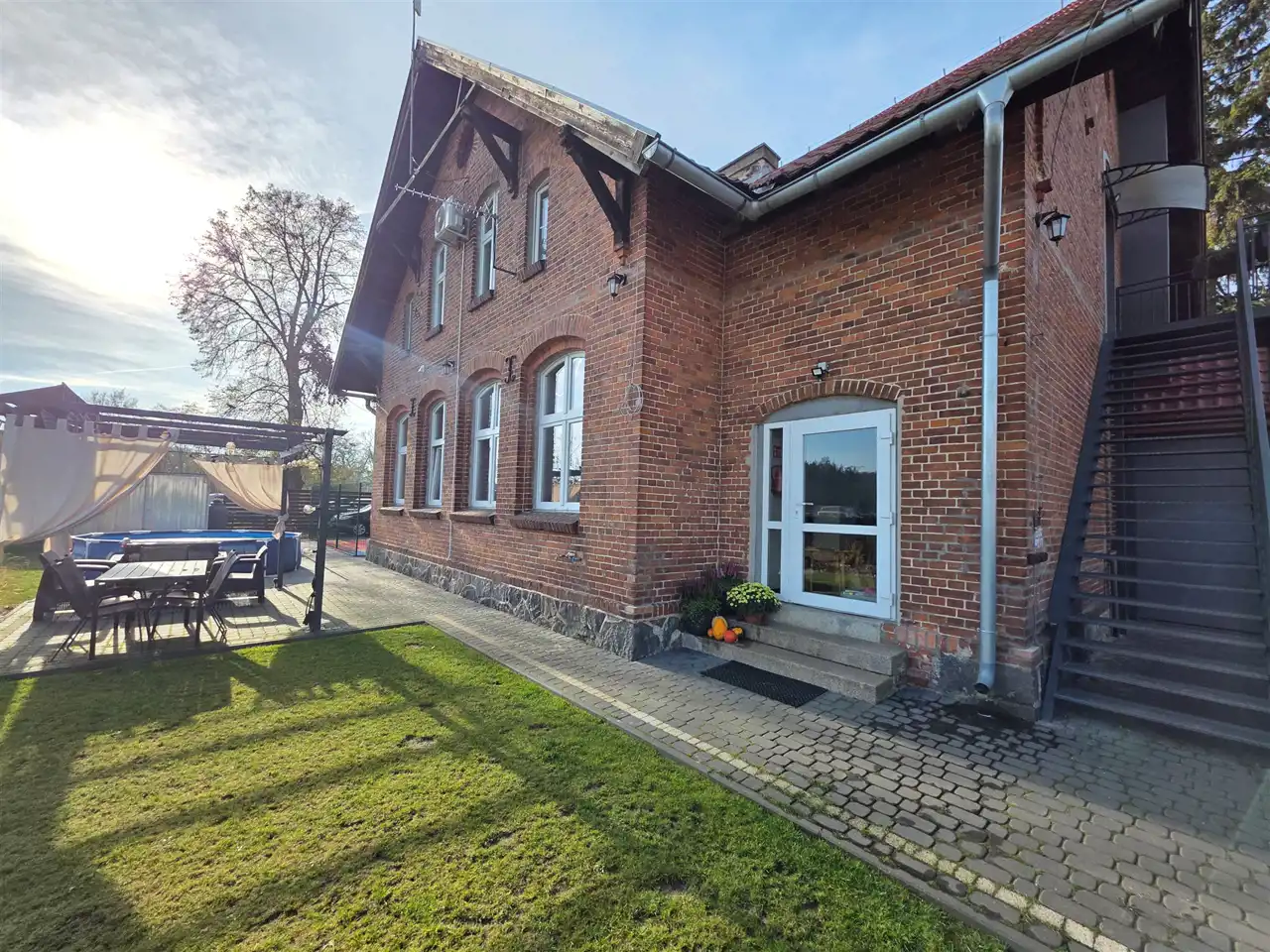 Na działce stoi **okazały, solidny budynek z cegły**, o grubych, zdrowych murach (ponad 50 cm), posadowiony na **stabilnym, kamiennym fundamencie**. Dach drewniany, deskowany, pokryty blachodachówką. Budynek w bardzo dobrym stanie technicznym, **na bieżąco remontowany i utrzymywany z dbałością**.