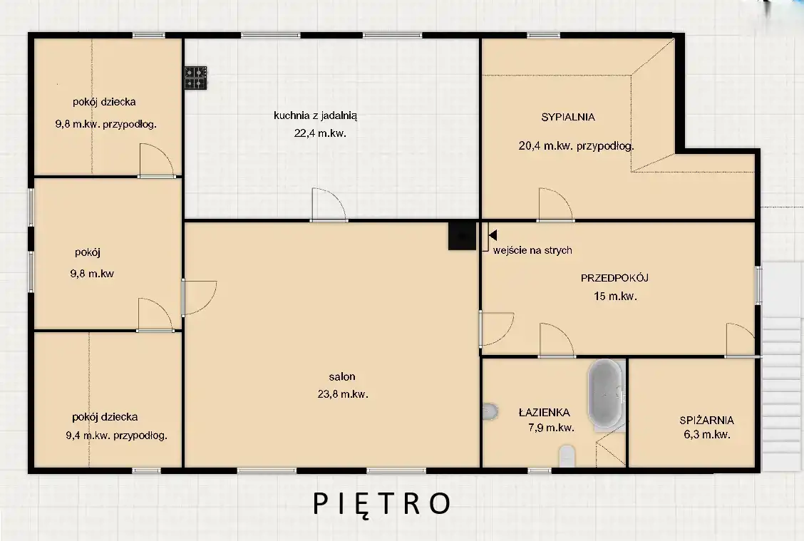 **Piętro – przestronne mieszkanie (124,51 m² całkowitej / 95,2 m² użytkowej)**