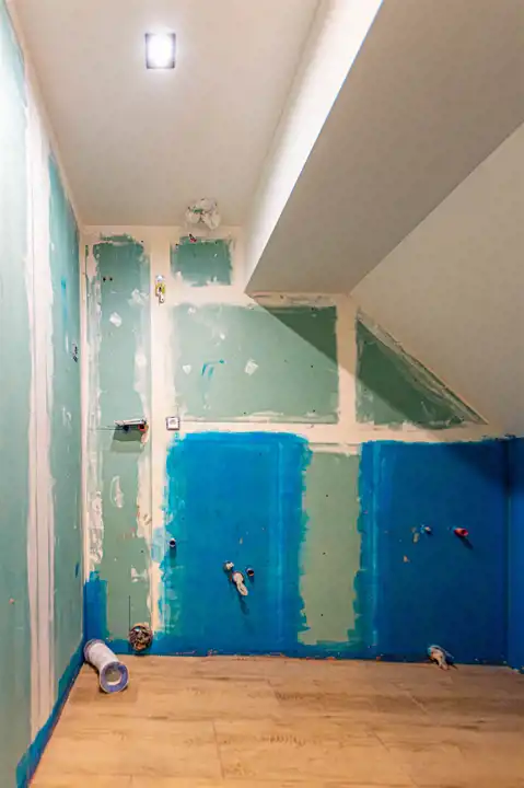 Do skończenia łazienka - wyprowadzone rury pod wannę, umywalkę i pralkę oraz przygotowane ściany pod położenie glazury i podłoga pod położenie terakoty.