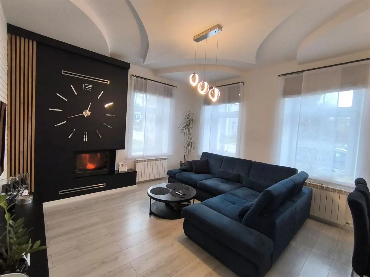 Salon z kominkiem jest przestronny i dzięki temu bez problemu pomieści duży narożnik oraz stół z krzesłami.