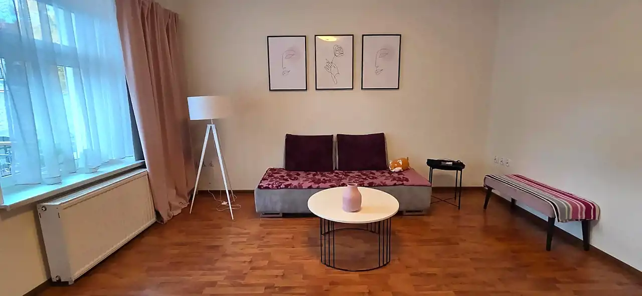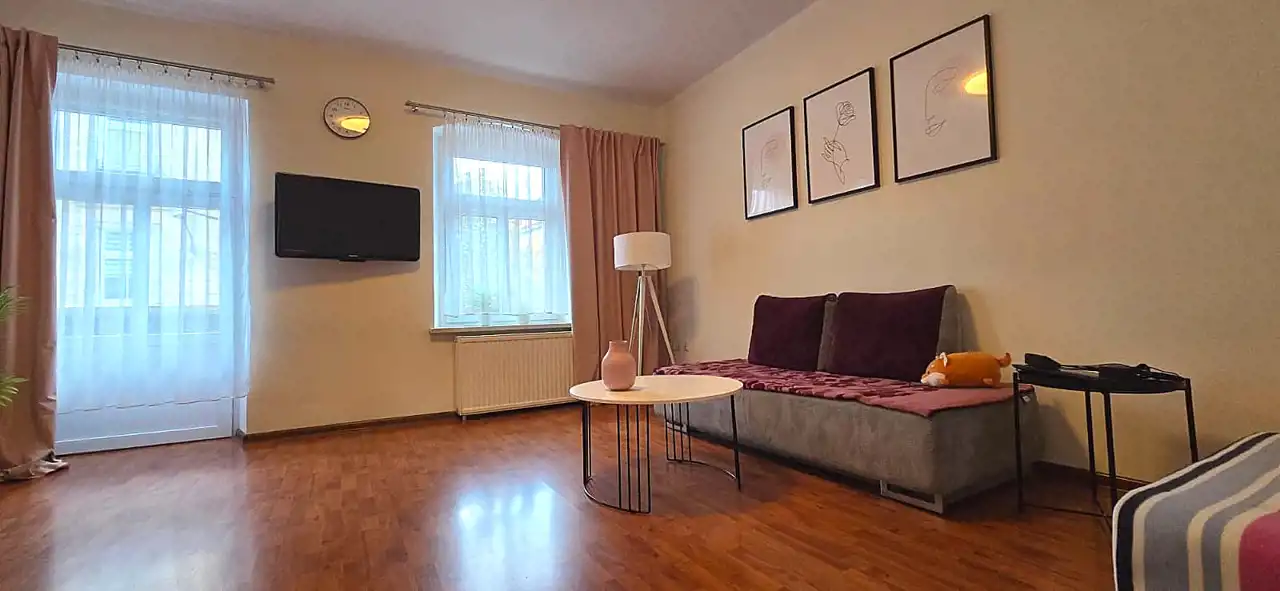 To przestronne, klimatyczne mieszkanie o powierzchni 116 m² znajduje się na 1. piętrze pięknie odrestaurowanej kamienicy przy głównym deptaku miasta.