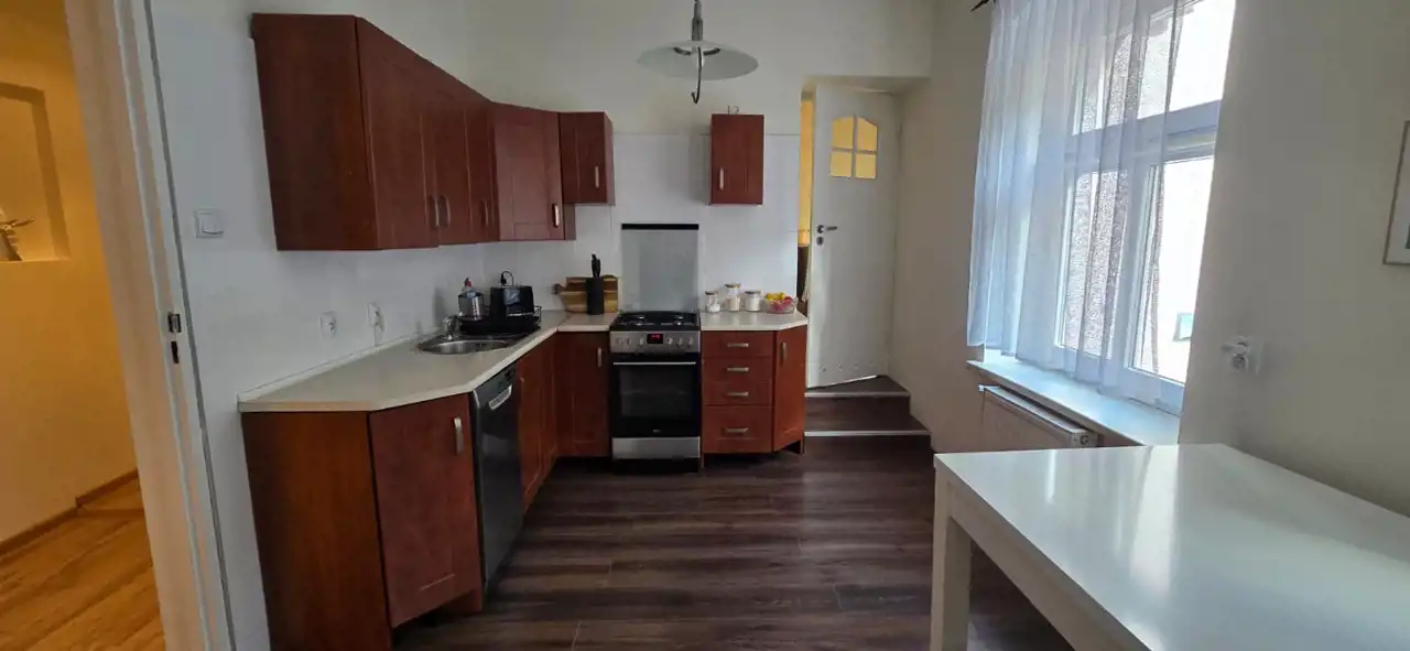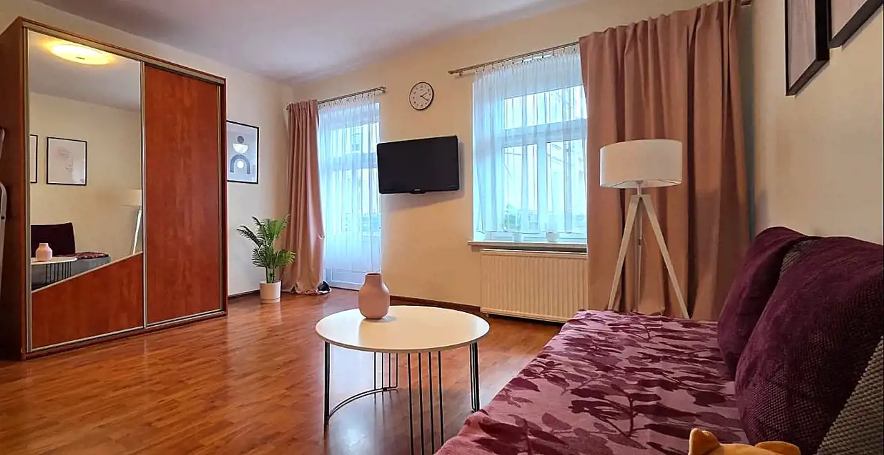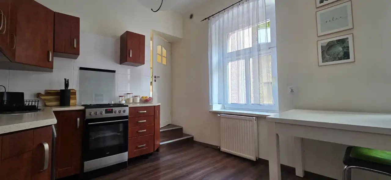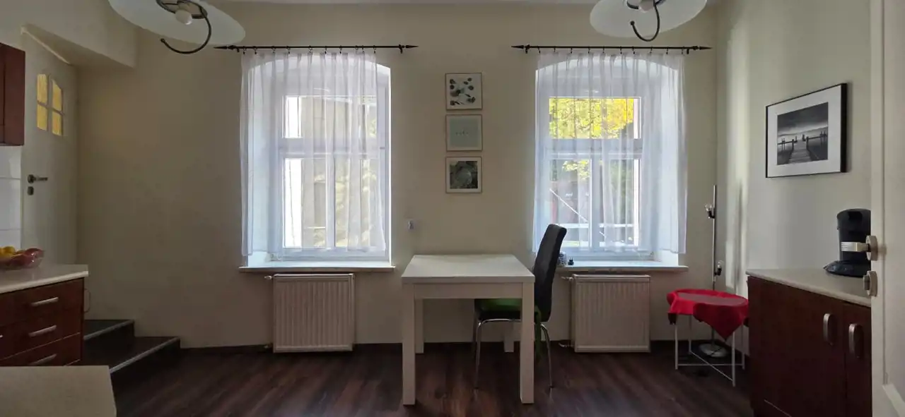 To przestronne, klimatyczne mieszkanie o powierzchni 116 m² znajduje się na 1. piętrze pięknie odrestaurowanej kamienicy przy głównym deptaku miasta.