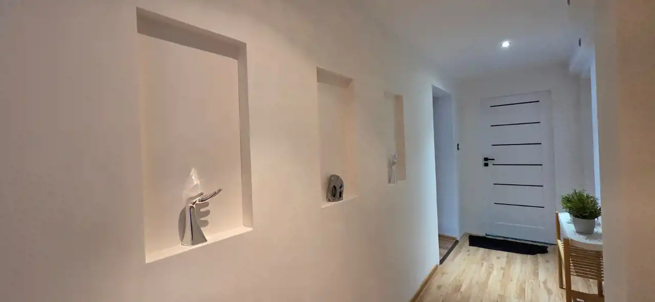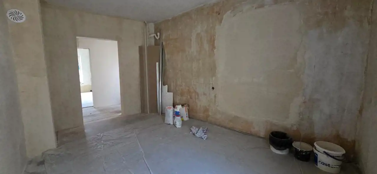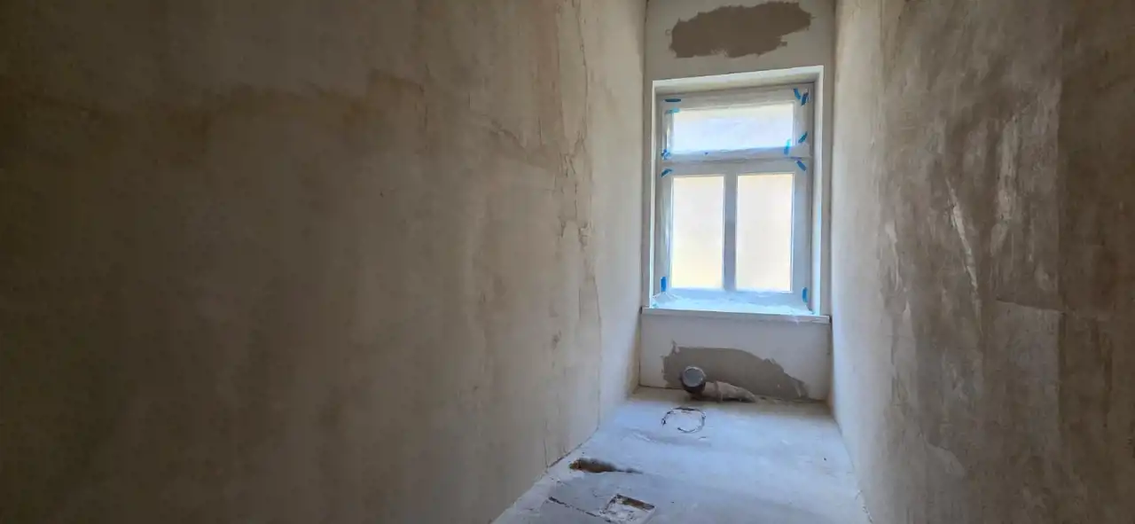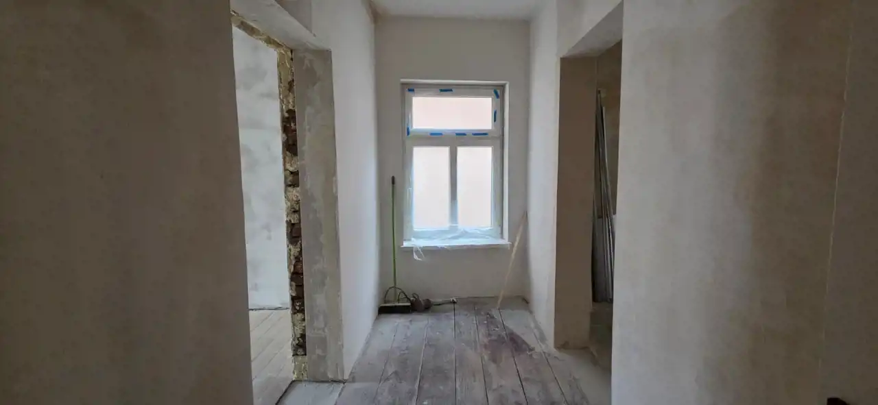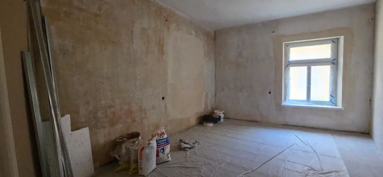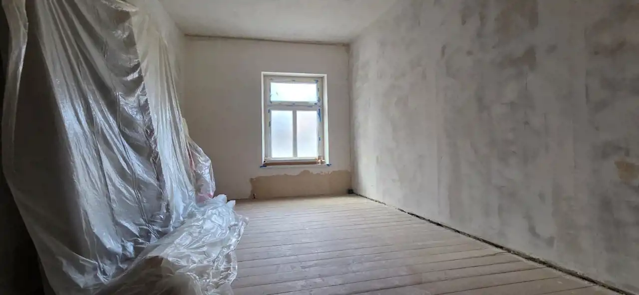 Część druga – w trakcie wykończenia, obejmuje dwa przestronne pokoje oraz łazienkę. Wykonano już wymianę okien na 3-szybowe i położono tynki. Pomieszczenia dają szerokie możliwości aranżacyjne według indywidualnych preferencji.